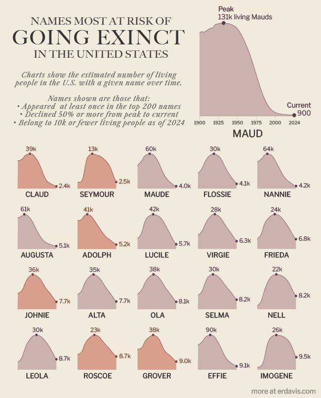 And, finally, designer Erin Davis has charts (and, at her site, an interactive) showing the names that are going extinct in the U.S.