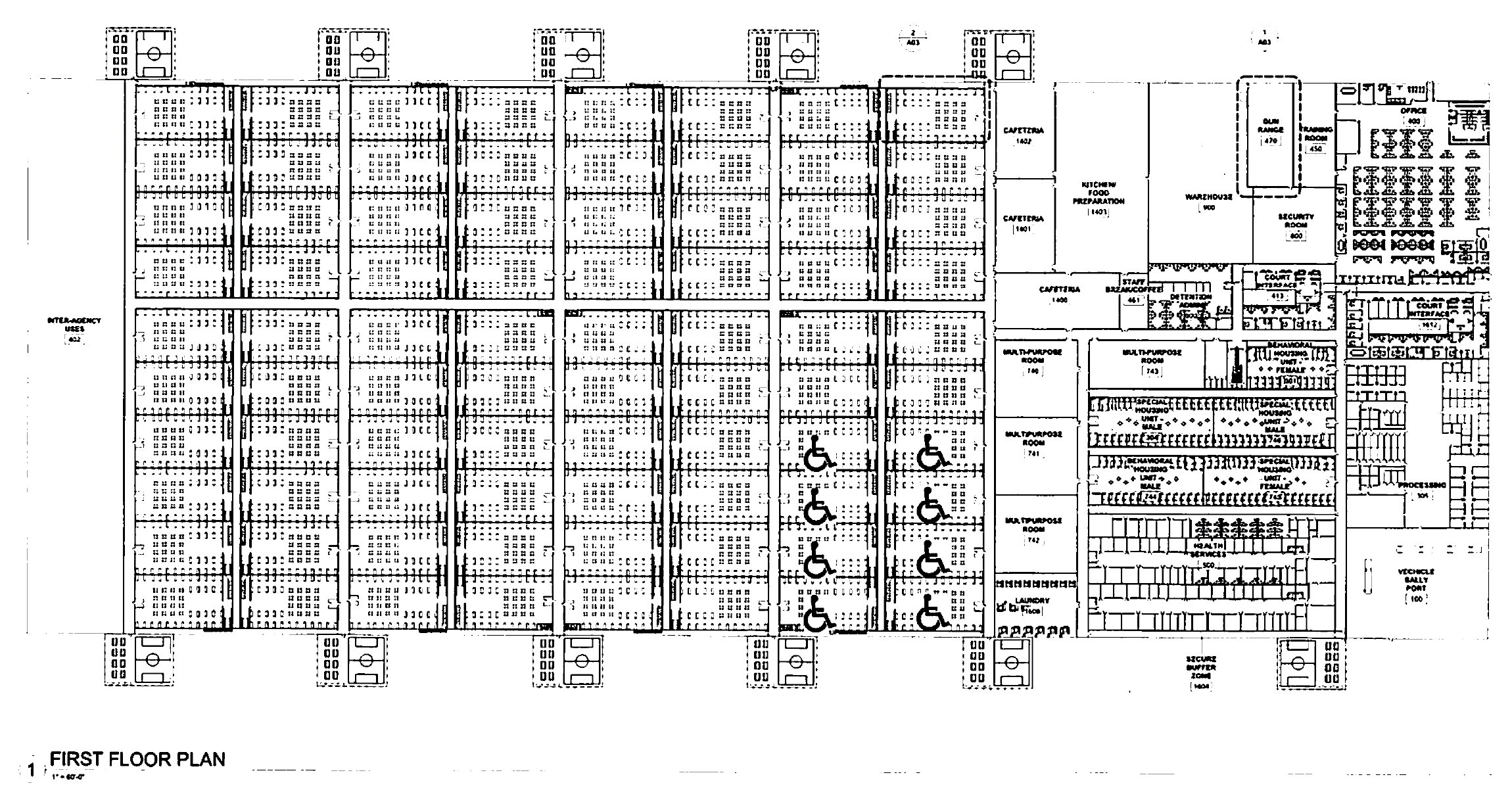 On the right side, you can see the intake and processing areas, as well as office space and a gun range. On the left: the "dormitory pods" — meaning beds. Nearly 5,000 of them, including some for detainees with disabilities. Row after row, cage after cage. In the full document, seen at the town's website, another 3,000-plus "pods" are to be built in a "mezzanine."