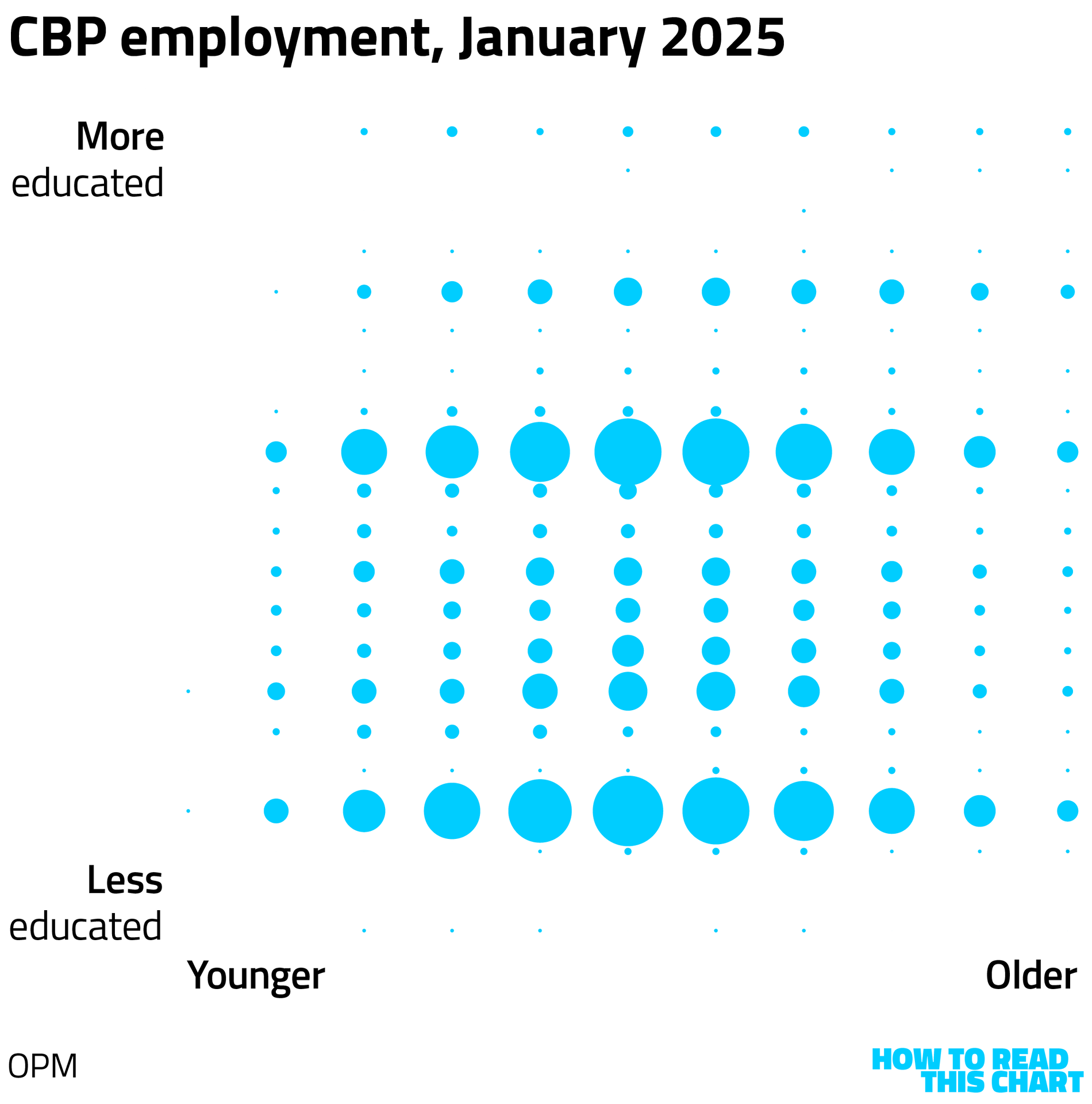 How to read this chart: This is also sort of a heat map, with education on the vertical axis and age on the horizontal. Most CBP agents have either a high school degree (the lower row of larger circles) or a college degree (the higher row of larger circles). Few are under the age of 20 (the far left, tiny column). Circles are scaled to the number of employees at that intersection of age and education.