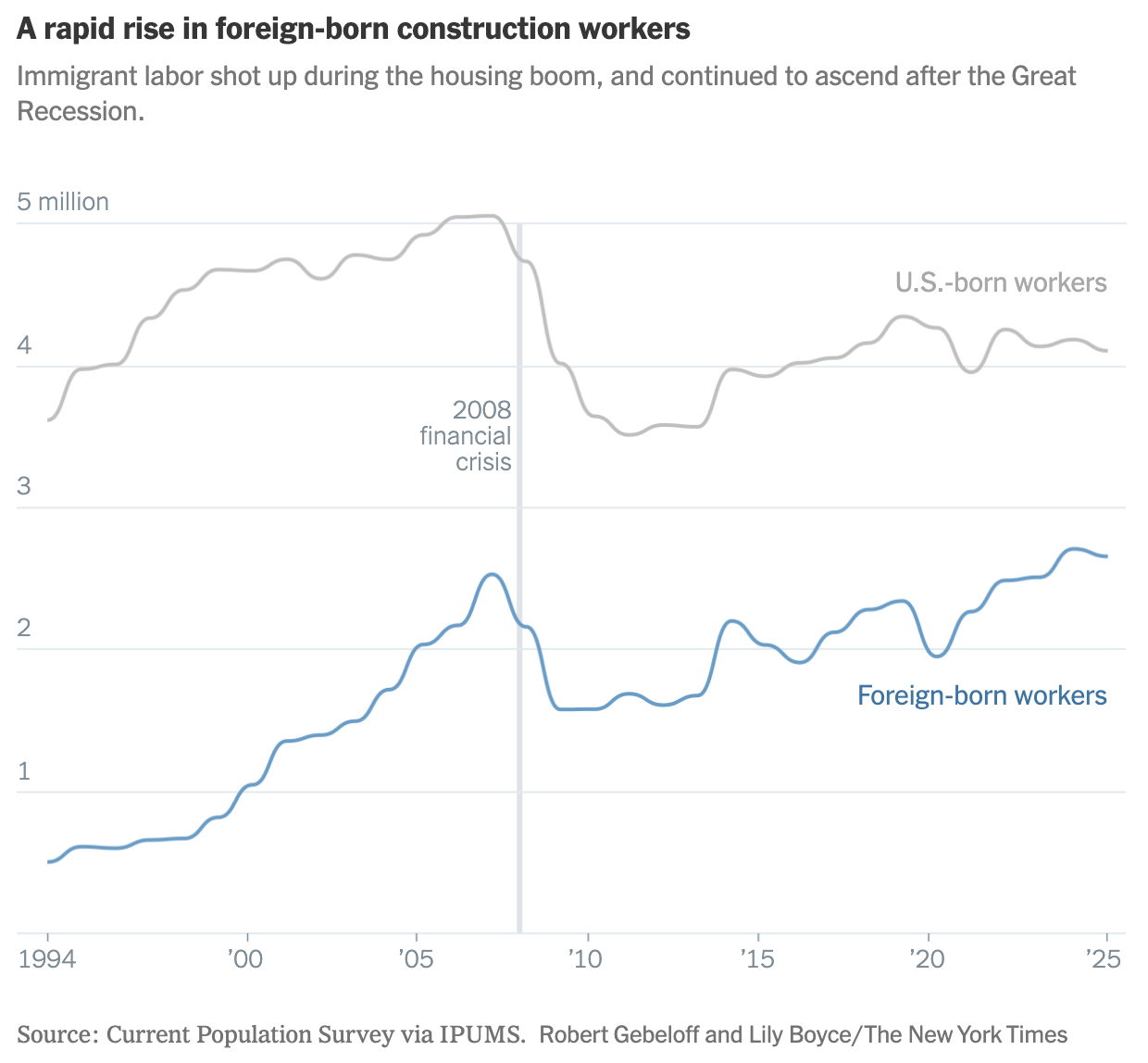 Oops. Sorry. I was supposed to be moving away from the news. OK, so how about The New York Times's look at how dependent the construction industry is on immigrant workers — a pattern that surged only after the collapse of the industry during the Great Recession.