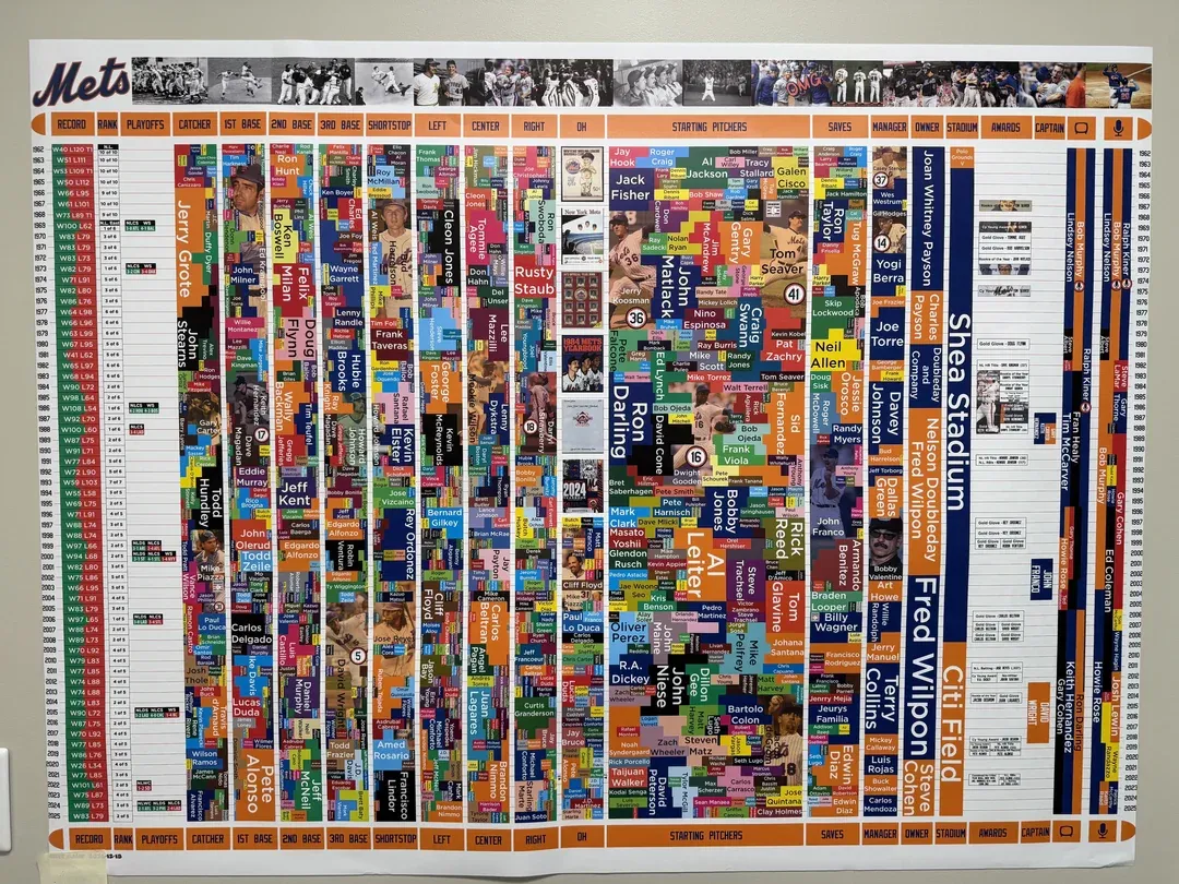 I made that chart, in case you couldn't tell from the little logo and the blindingly aggressive color scheme. I did not make the chart below, showing the evolution of the New York Mets roster and ownership since the team's inception, but I wish I had.