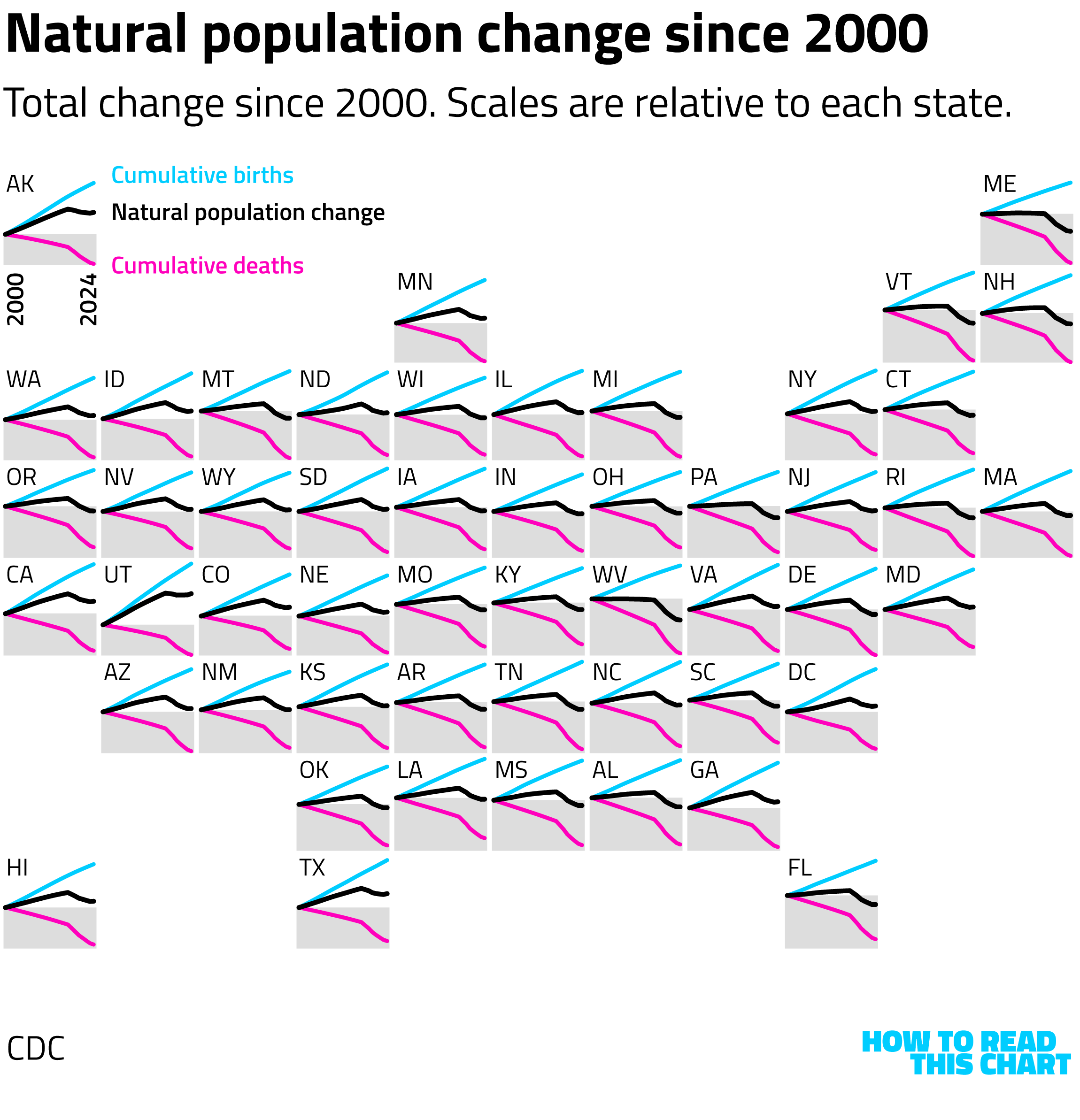 But the combination of the baby boom getting older (its oldest member turned 80 on Jan. 1 of this year) and the advent of the coronavirus pandemic means that a number of states have seen negative natural population change — that is, more deaths than births — since 2000.