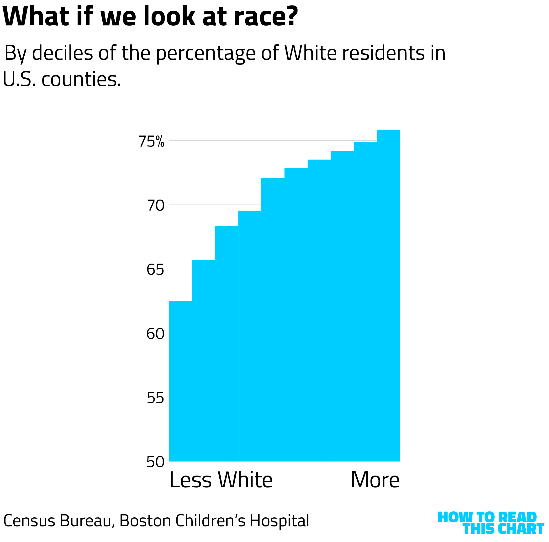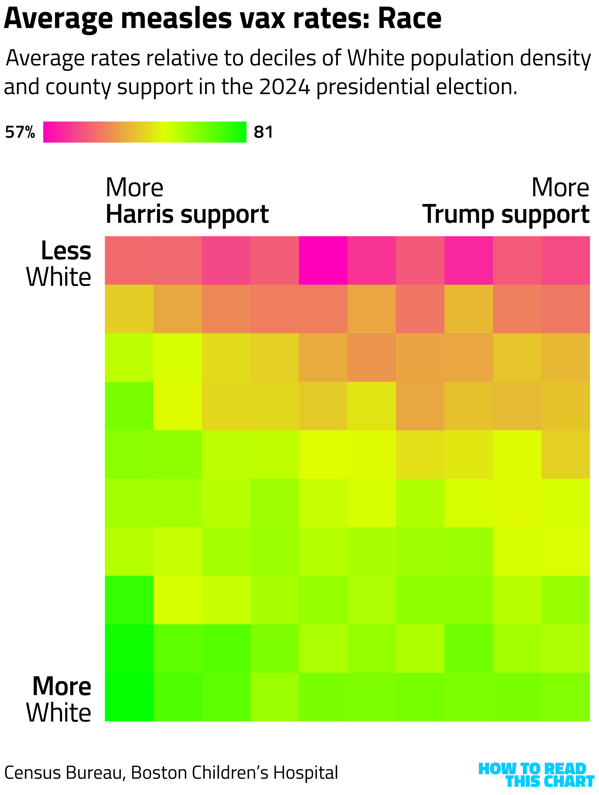 It shouldn't have been a surprise for another reason, too. After I pulled the data and made all these graphs, I went back and looked at the ABC News map again. The region with the most obvious elevated rates of measles risk? A sweep through the Deep South and into the Southwest — or, places with larger non-White populations.