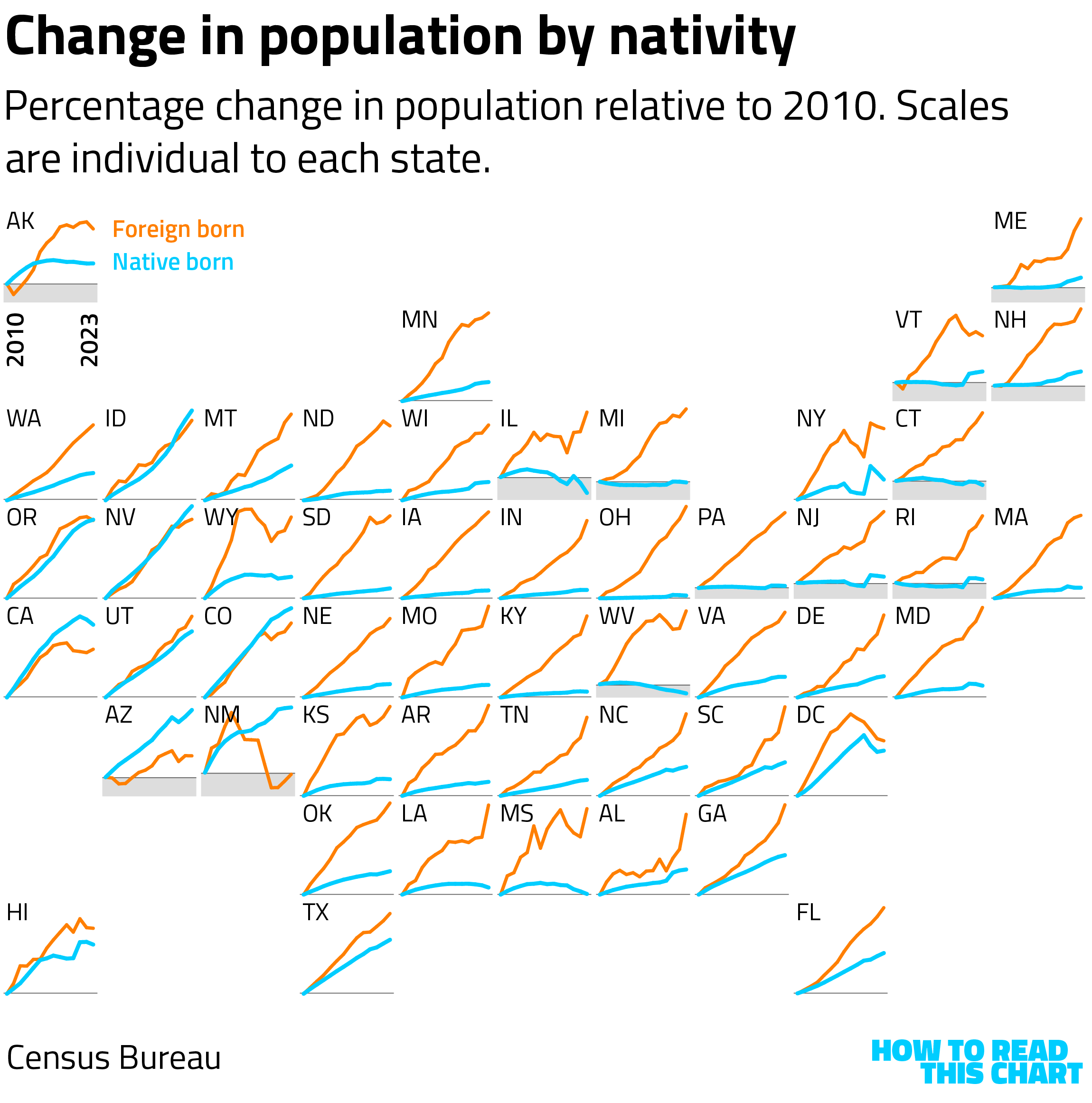 See how in nearly every state the rate of immigrant population growth is higher than the rate of growth among native-born Americans? In some cases, states have only grown because they've welcomed immigrants — a preview of the challenge that is looming for the whole country.