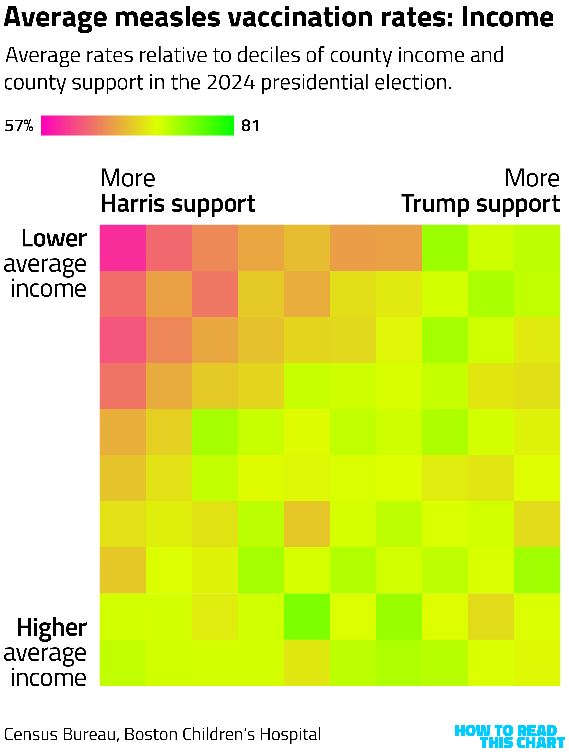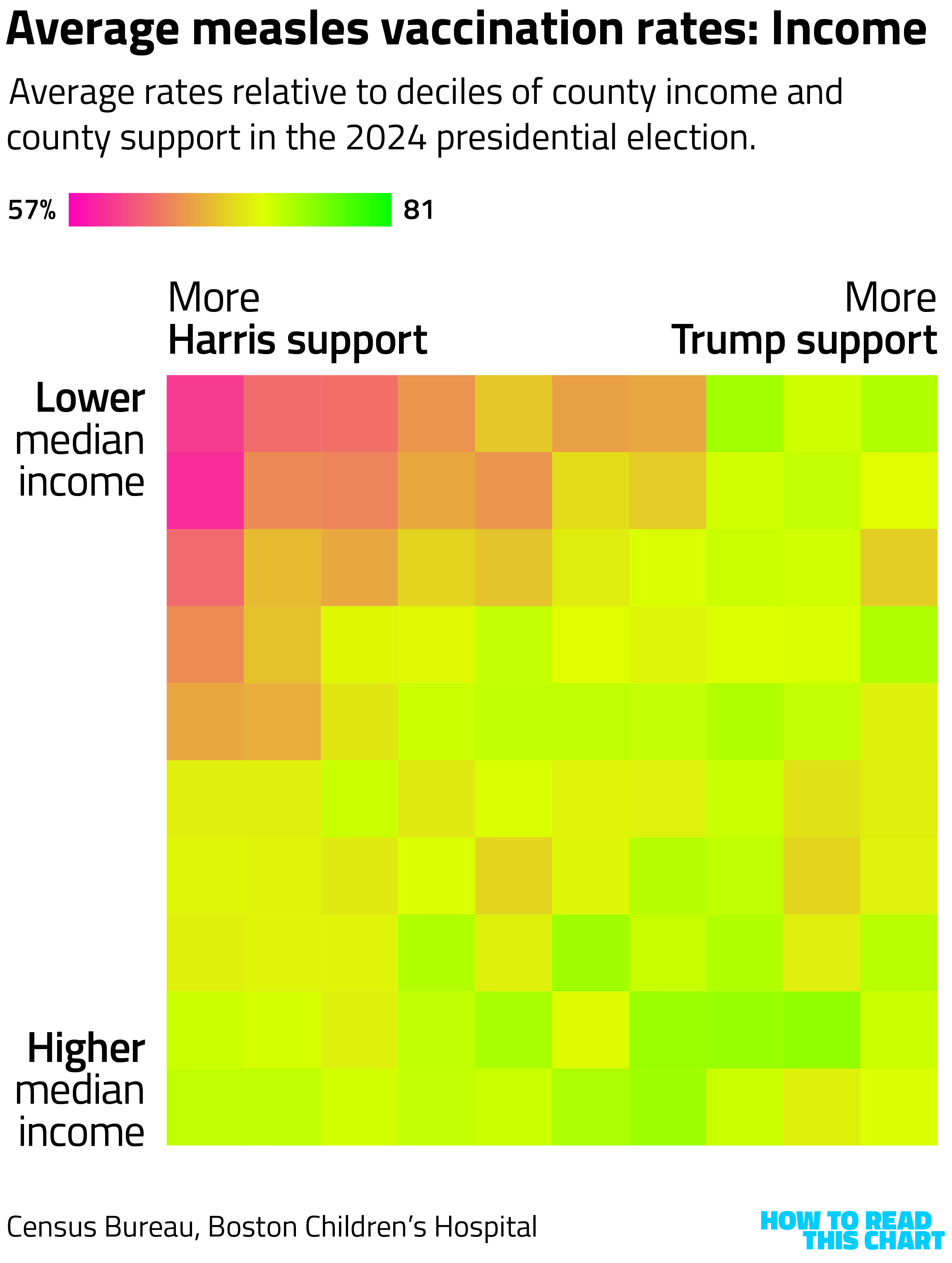 How to read this chart: This is essentially a heat map, showing values for 100 clusters of counties. At top left, the counties that are among the 10% with both the lowest median incomes and the biggest margins for Kamala Harris in 2024. At bottom right, the counties that are among the 10% with both the highest median incomes and biggest margins for Donald Trump. The more red, the lower the average vaccination rate.