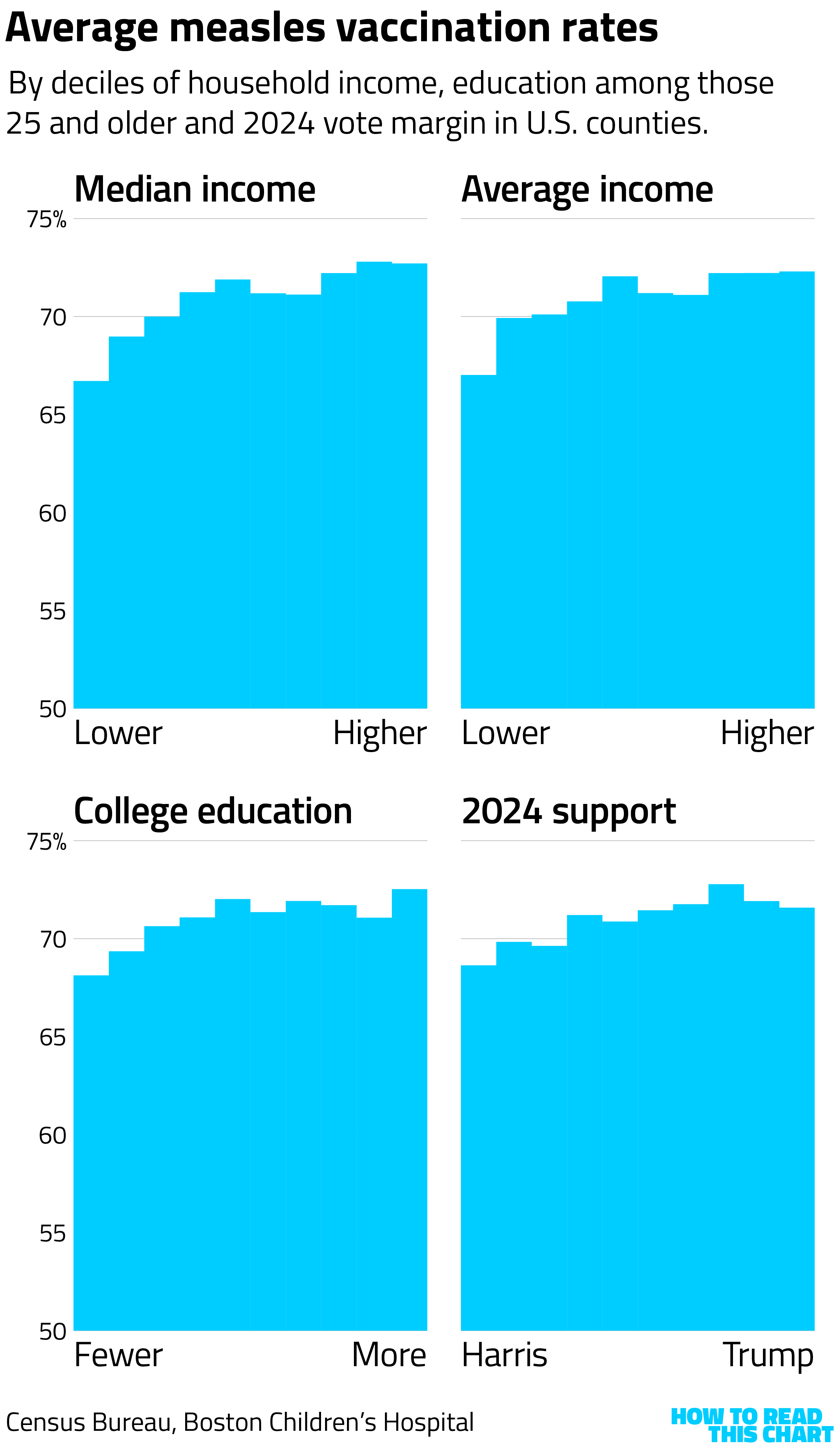 For example, I was curious whether these numbers mirrored the decline in support for vaccination that accelerated among Republicans (and Republican presidential administrations) after covid-19 emerged. I was also curious how rates correlated to income.