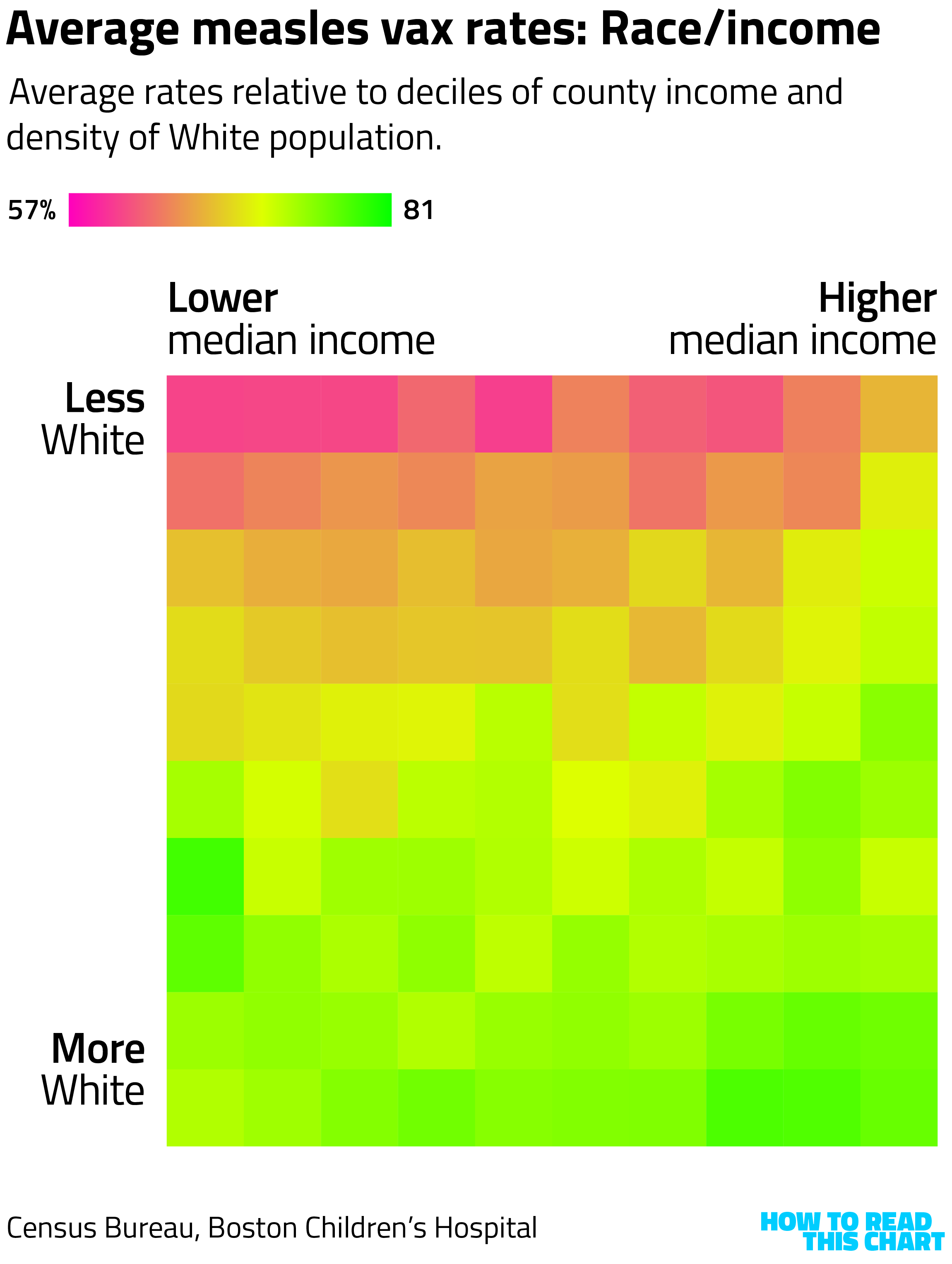 If we compare race and income, we see that race is still a stronger predictor of vaccination rates (since the gradient is more obvious from top to bottom than left to right).