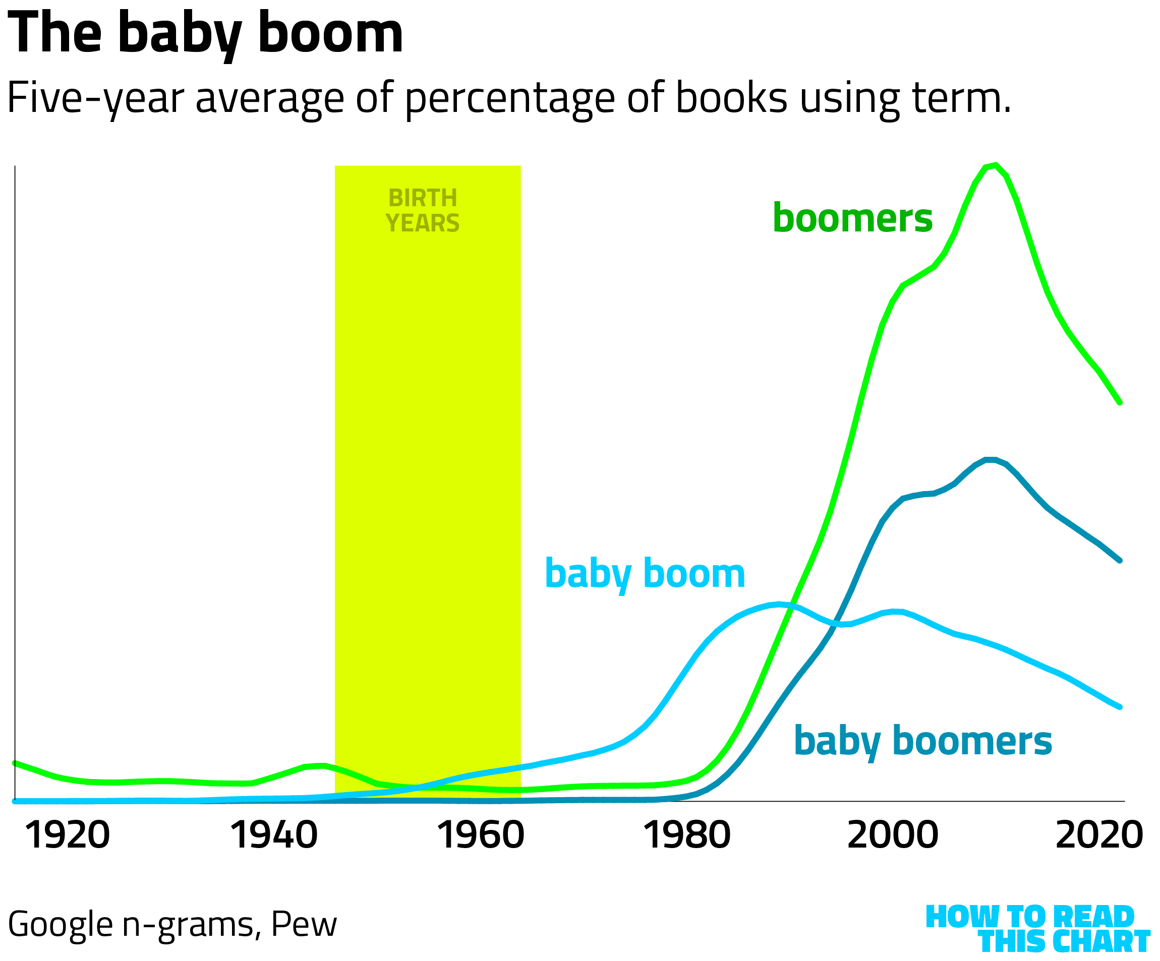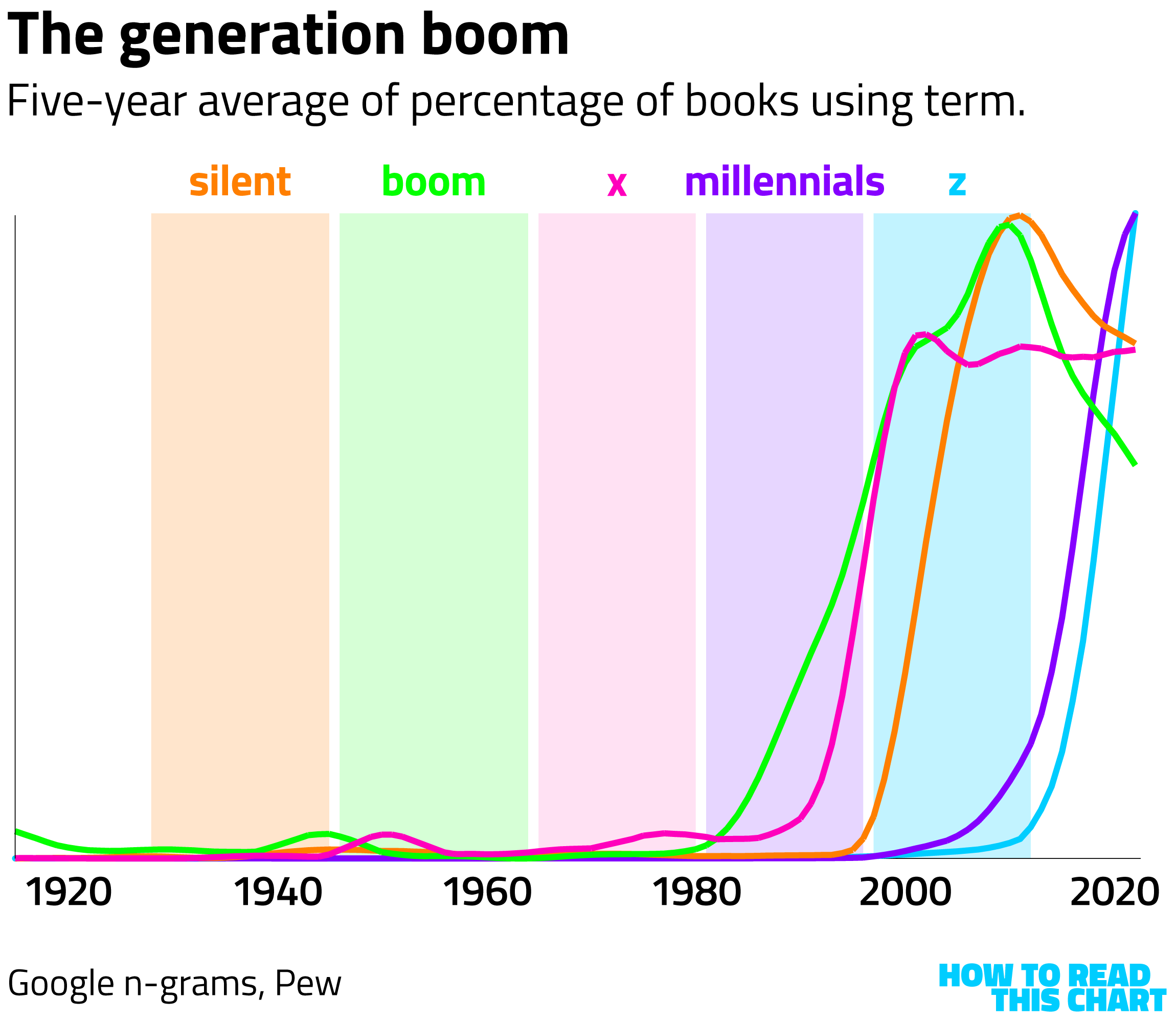 (On each of these charts, the vertical scale is determined by the highest percentage of annual mentions of the depicted terms over the course of the century. In other words, one generation's peak is not to scale relative to another generation's.)