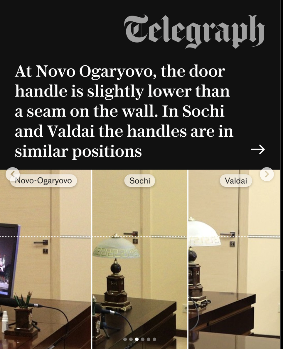 The Telegraph, for example, put together a report showing that Russian President Vladimir Putin has replicas of his office all over the country which can be differentiated by things like how the door handle lines up with the wall.