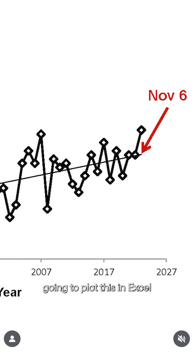That's how ginkgos work; all the leaves drop at once. And by tracking that date over time, we see that the leaf-drop is happening later and later, as though something in the climate is changing somehow?