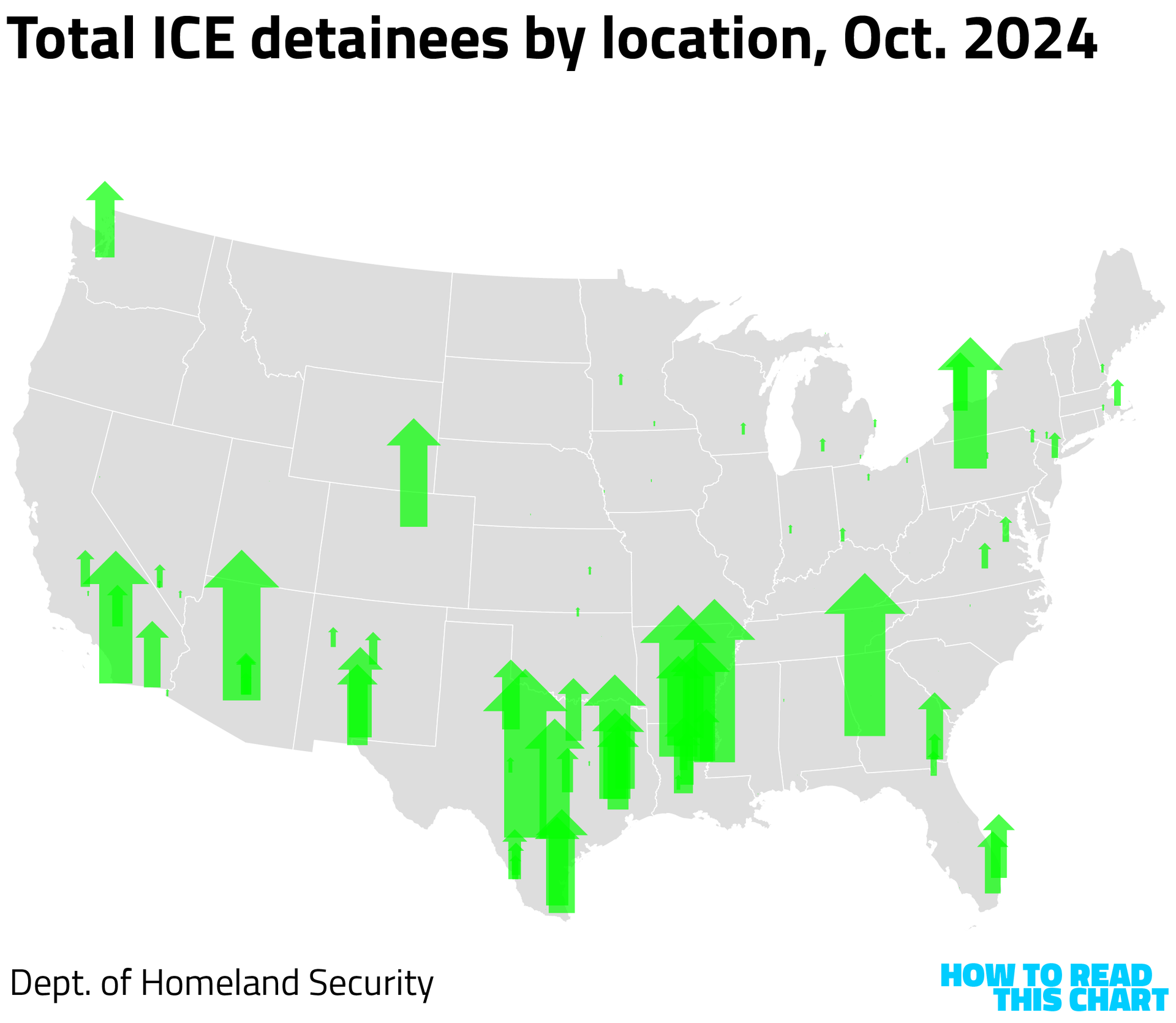 There are more than 200 facilities around the country where detainees are kept, including a lot of local jails. Comparing detentions now with data from last year, you can see the huge surge in the number of people being kept in custody — and the geographic distribution of where they're being kept.