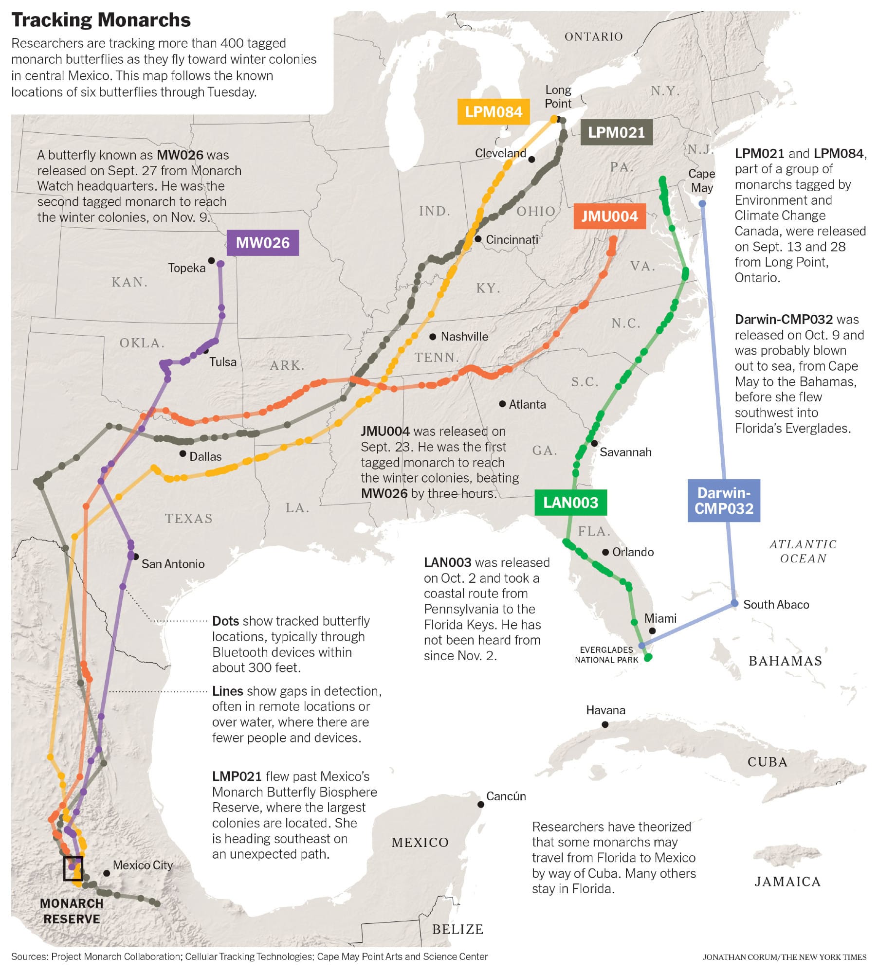 Oops, sorry. More sarcasm seeped in. So allow me to offer a non-sarcastic appreciation for the New York Times' report on the movements of individual monarch butterflies across North America.