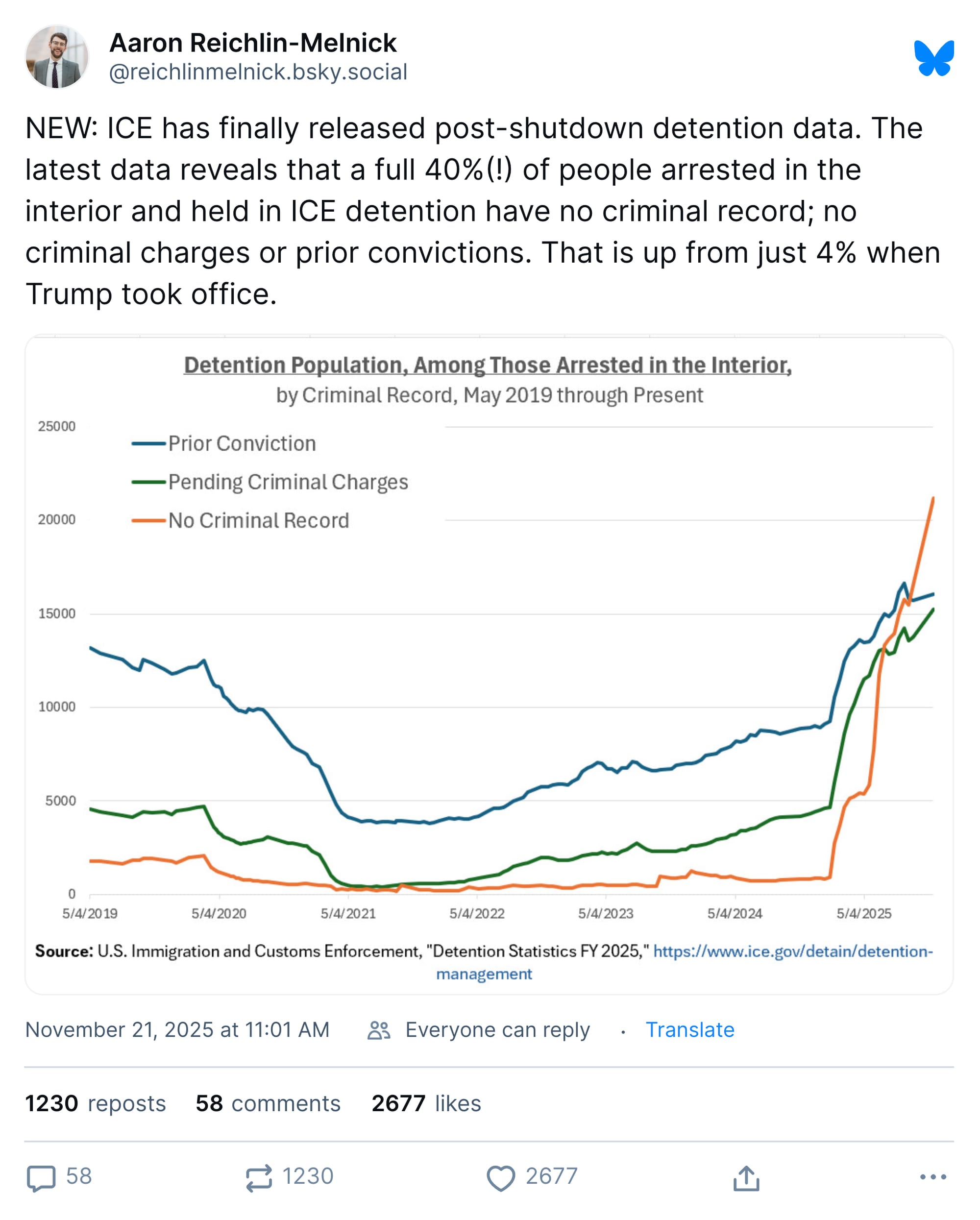 Over the past ten months, as you know, the federal government has shifted its immigration enforcement focus from "dangerous criminals" to "everyone." There's been a big jump in the number of people detained by Immigration and Customs Enforcement who have criminal records or pending criminal charges, but a huge jump in the number of detainees who have neither.