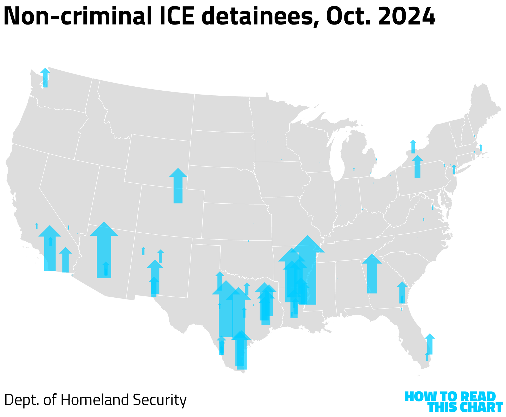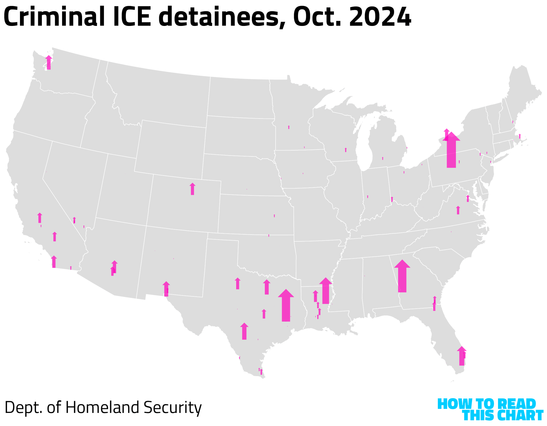 The number of detainees with criminal records has grown more modestly, in keeping with the data above. (All of the arrows on these maps share a common scale.)