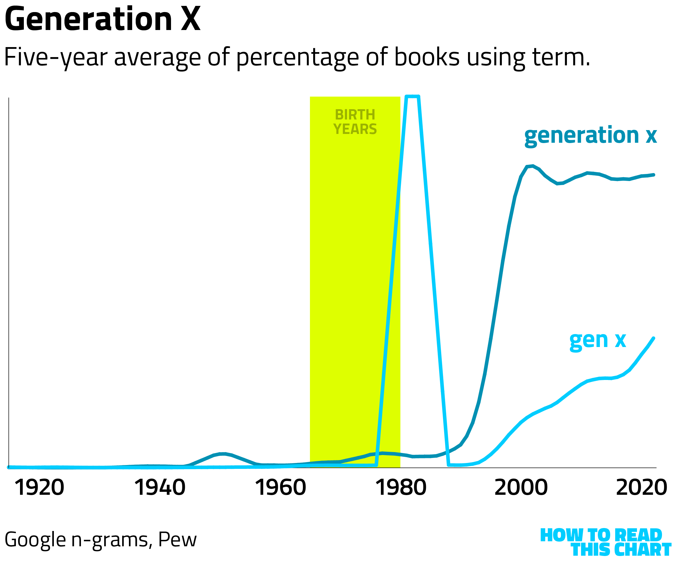 The now familiar "Gen X" shorthand had an anomalous peak in the 1980s, but the use as a generational descriptor also surged in the 1990s and early 2000s.