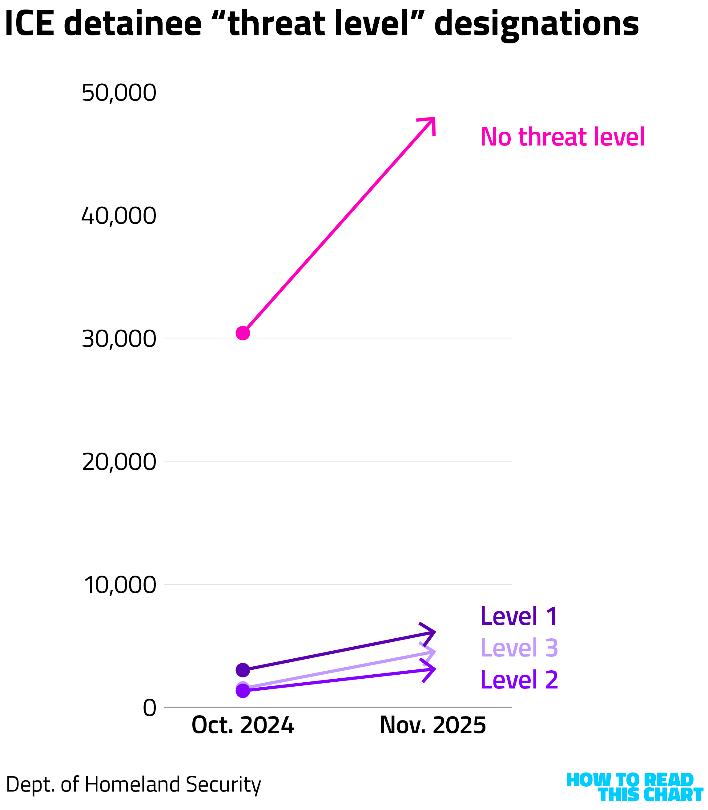 We know this because the government regularly publishes data on who is being held in detention. That data includes the number of detainees, the facilities where they are being held and their criminal records and "ICE threat level" determinations. It's enough data, compiled long enough, that we can visualize how immigration detention has changed since Donald Trump returned to the White House.