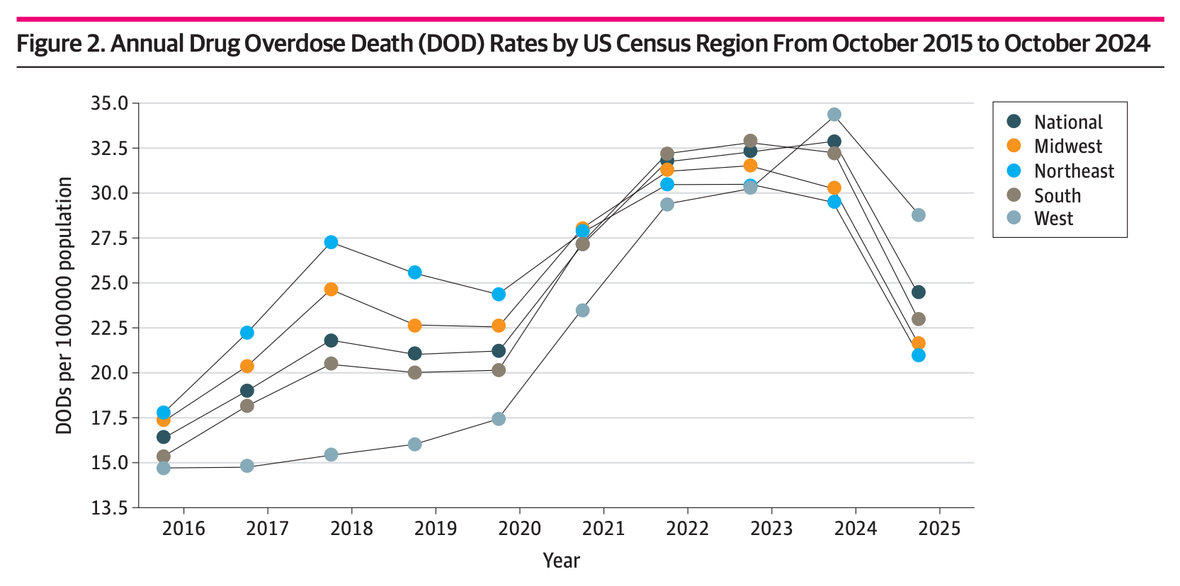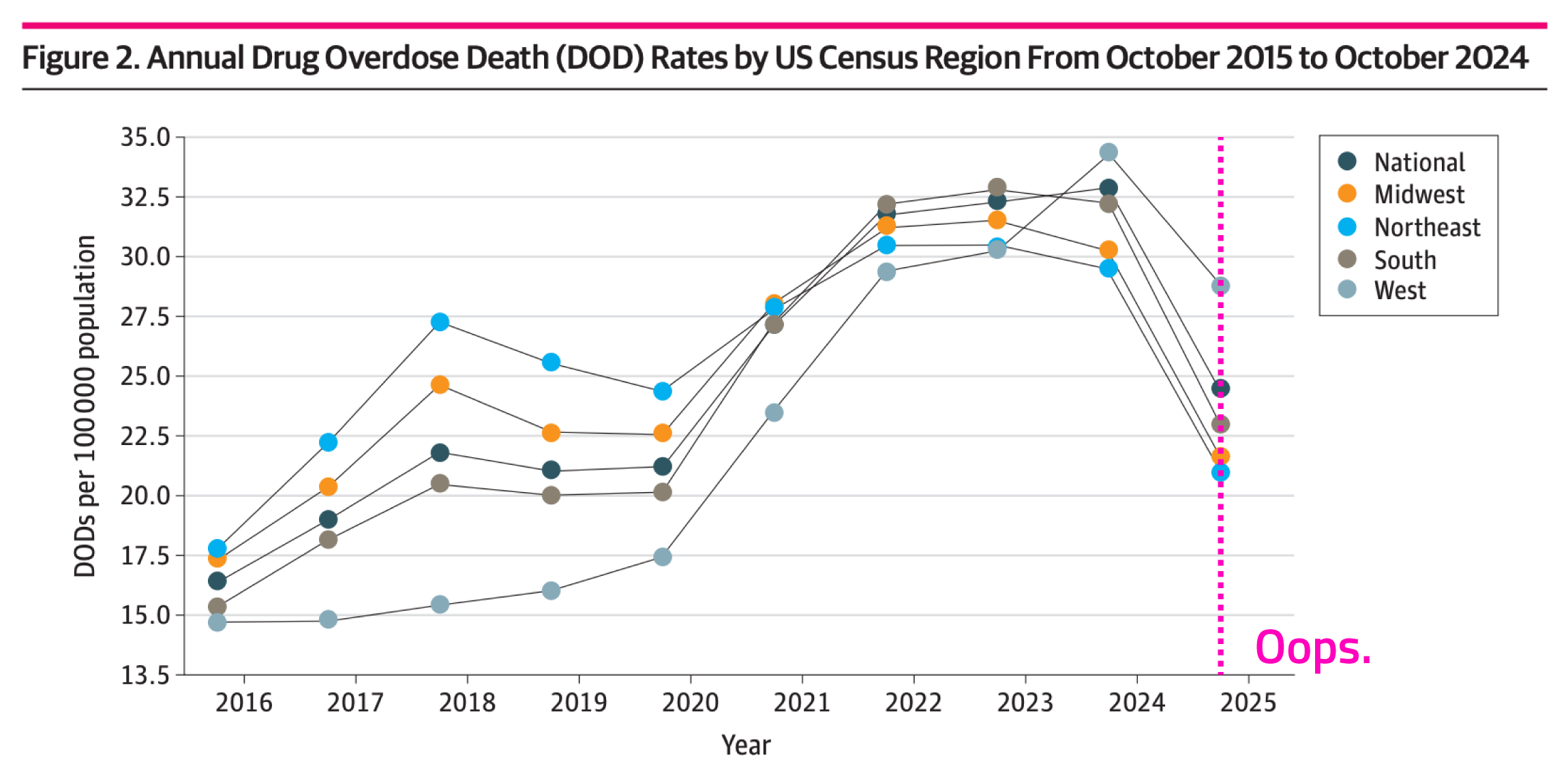 On Tuesday, she shared this chart from recent research showing a decline in drug overdose deaths, declaring that it demonstrated how "the Trump Administration and this Department of Justice have been fighting to end the drug epidemic in our country."