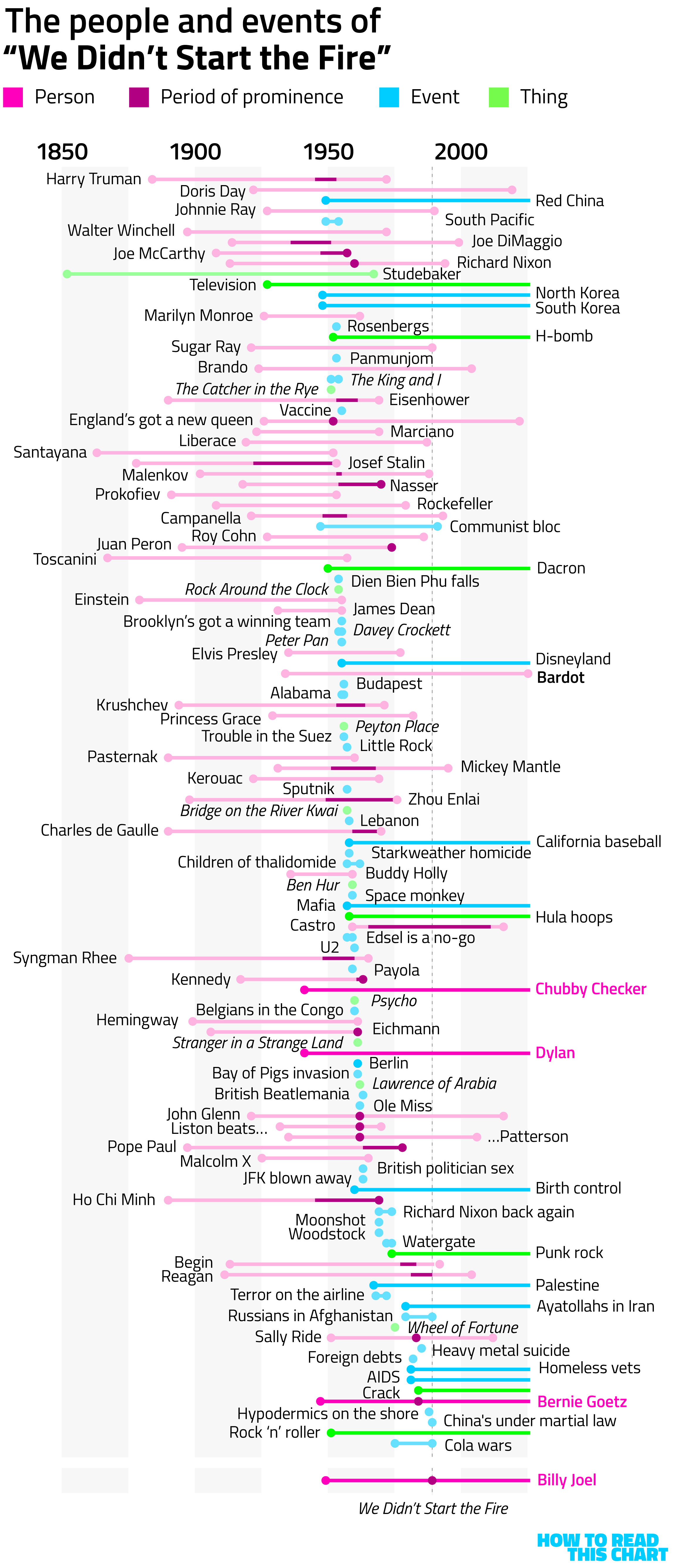 How to read this chart: For each topic in the song, I show either its lifespan or the year it occurred. For people who were included for specific achievements, like astronaut Sally Ride, I indicate when that achievement occurred. Circles indicate events or truncation, so living people and still-extant things have no terminating circles. For plays or books that still exist, I indicated only release dates or theatrical runs.
