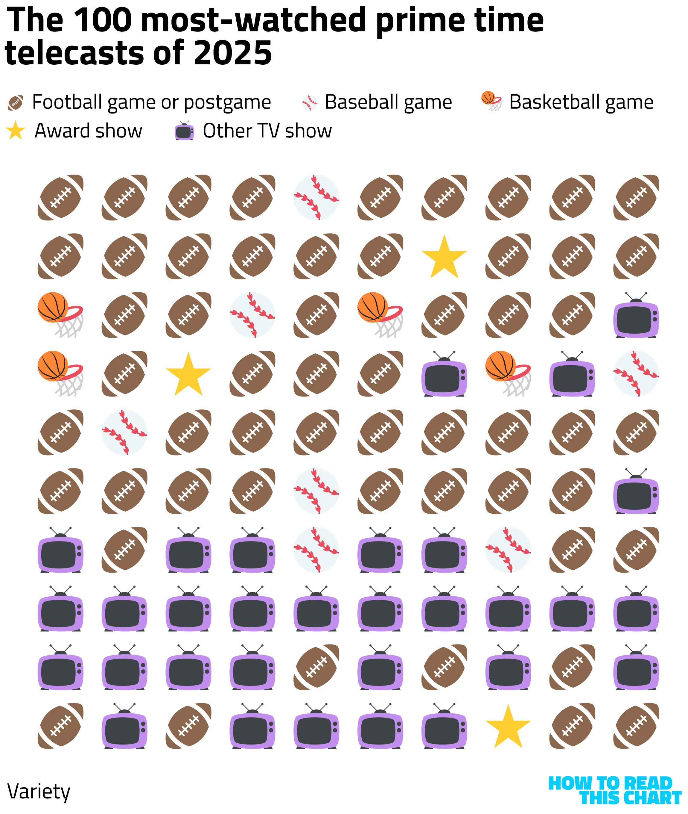I think I mentioned that I'd compiled more stuff than I knew what to do with? With that in mind, here, in order, are the categories of the 100 most-watched prime time telecasts of 2025, in order from first to 100th, displayed as emojis.