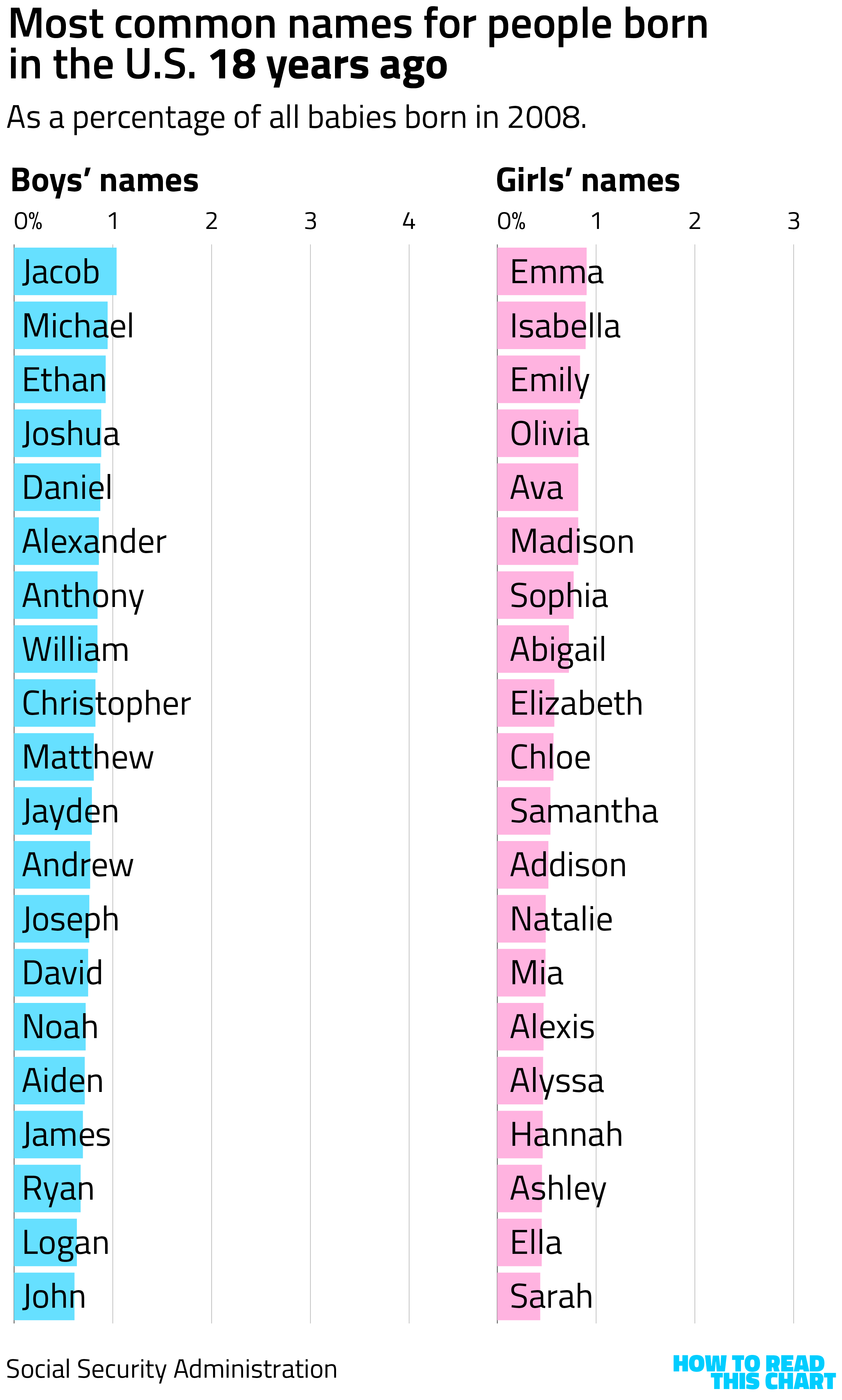 Contrast that with the most common names of people born in 2008, 2026's newly minted adults.