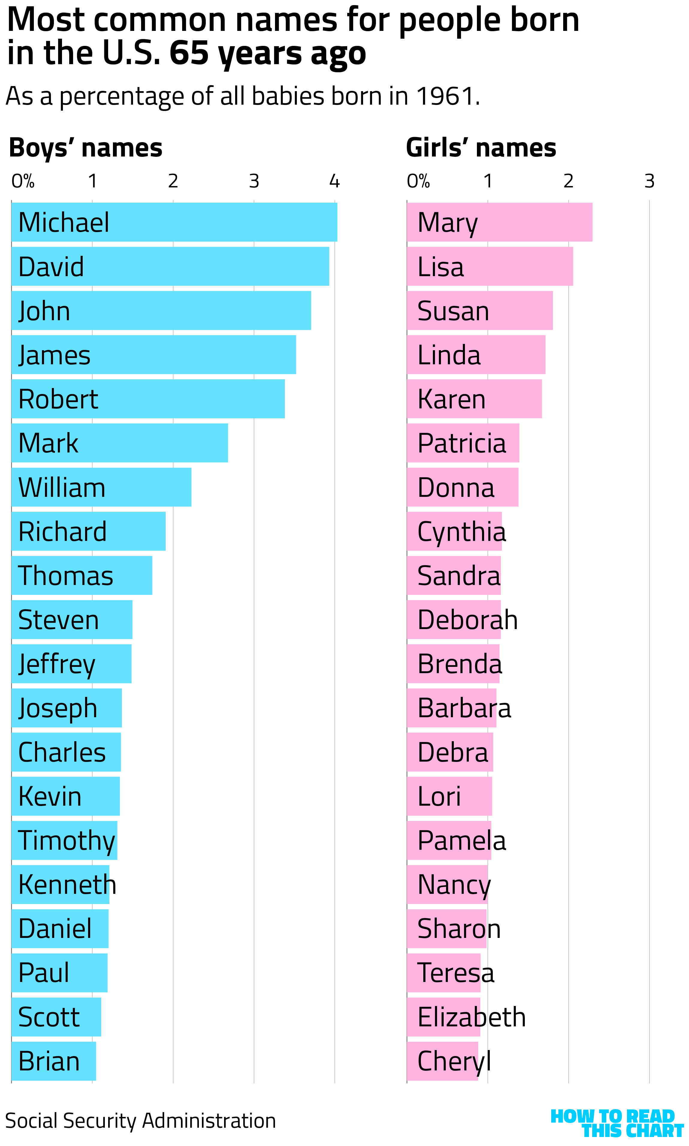 With the new year rolling around, I thought it would be interesting to see how names had changed over time. For example, here are the most common names of people born in 1961 — people who will this year be reaching retirement age. (And, I'll note: People who were born at the tail end of the baby boom.)
