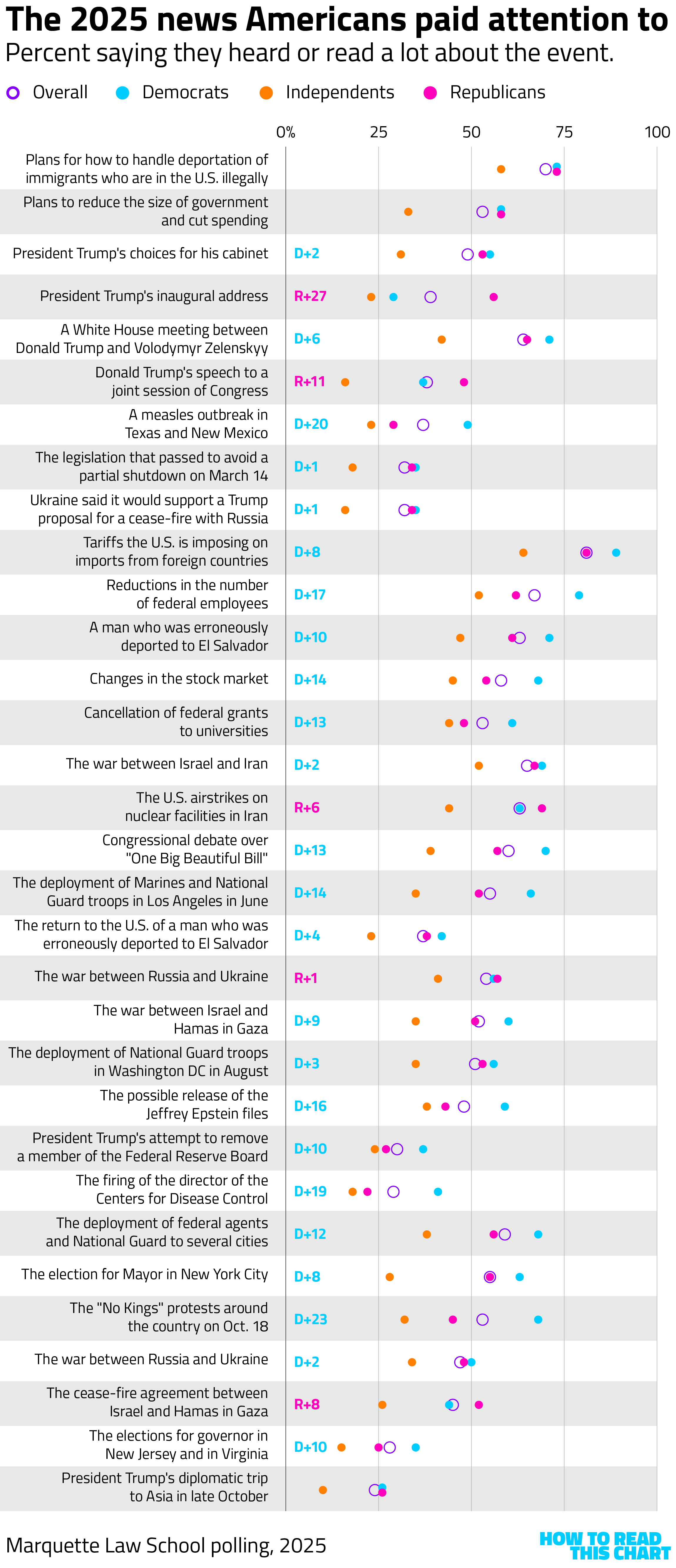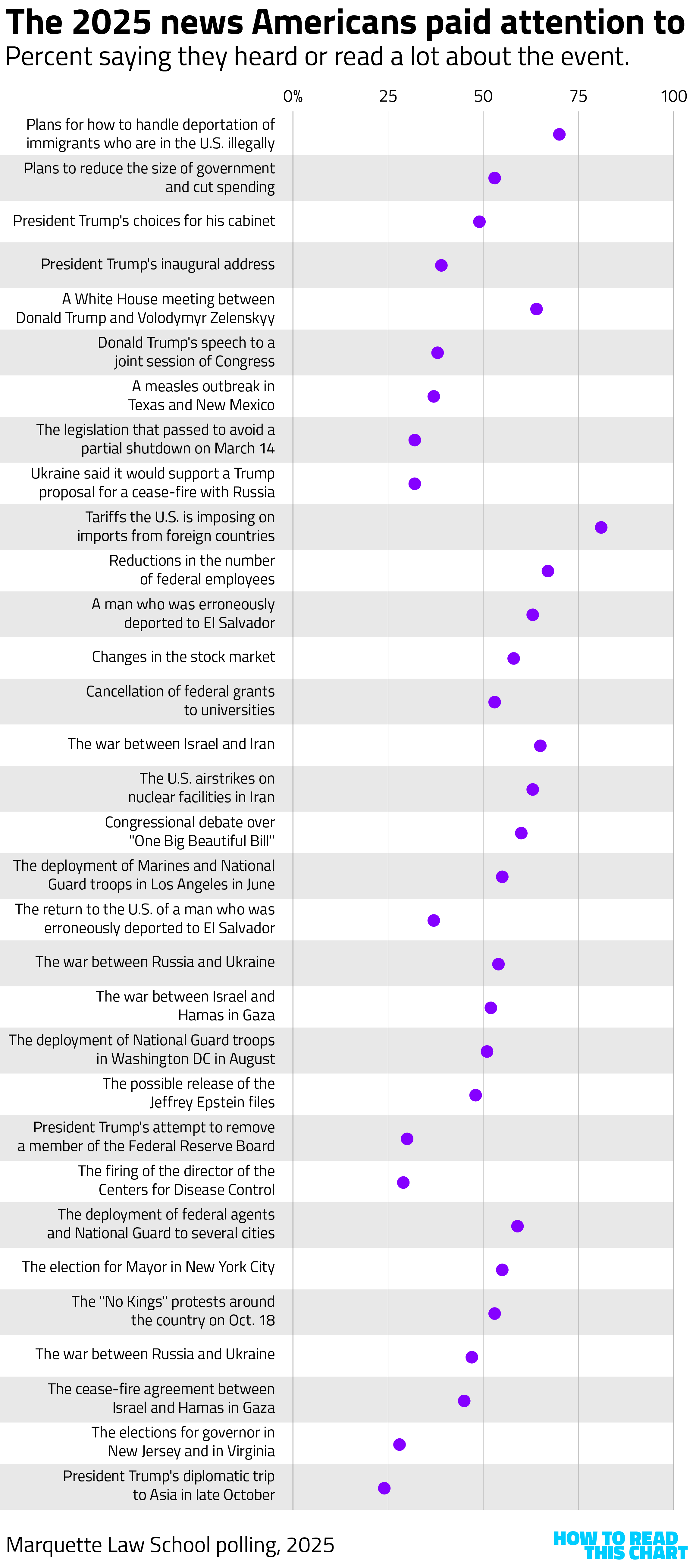 The polling team at Marquette Law School took a different approach. Over the course of 2025, they asked Americans how much they'd read or heard about various things in the news, as poll director Charles Franklin explained last month. Delineated in chronological order below, the news story that got the most attention was President Trump's tariffs.