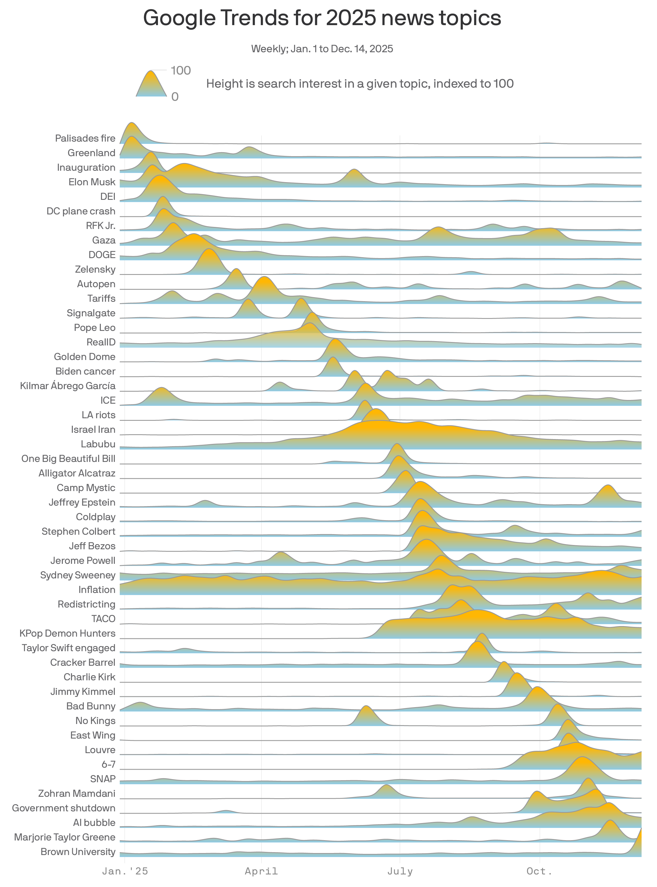 Some topics arise and fade in interest, as did "Camp Mystic" in 2025 — the site of a deadly flood in Texas. Others build and wane over a longer time period, like interest in Labubu, a deadly monkey-toy-thing. (It is probably not actually deadly.) Some rise and stay high, like inflation (both literally and in Google's search data).