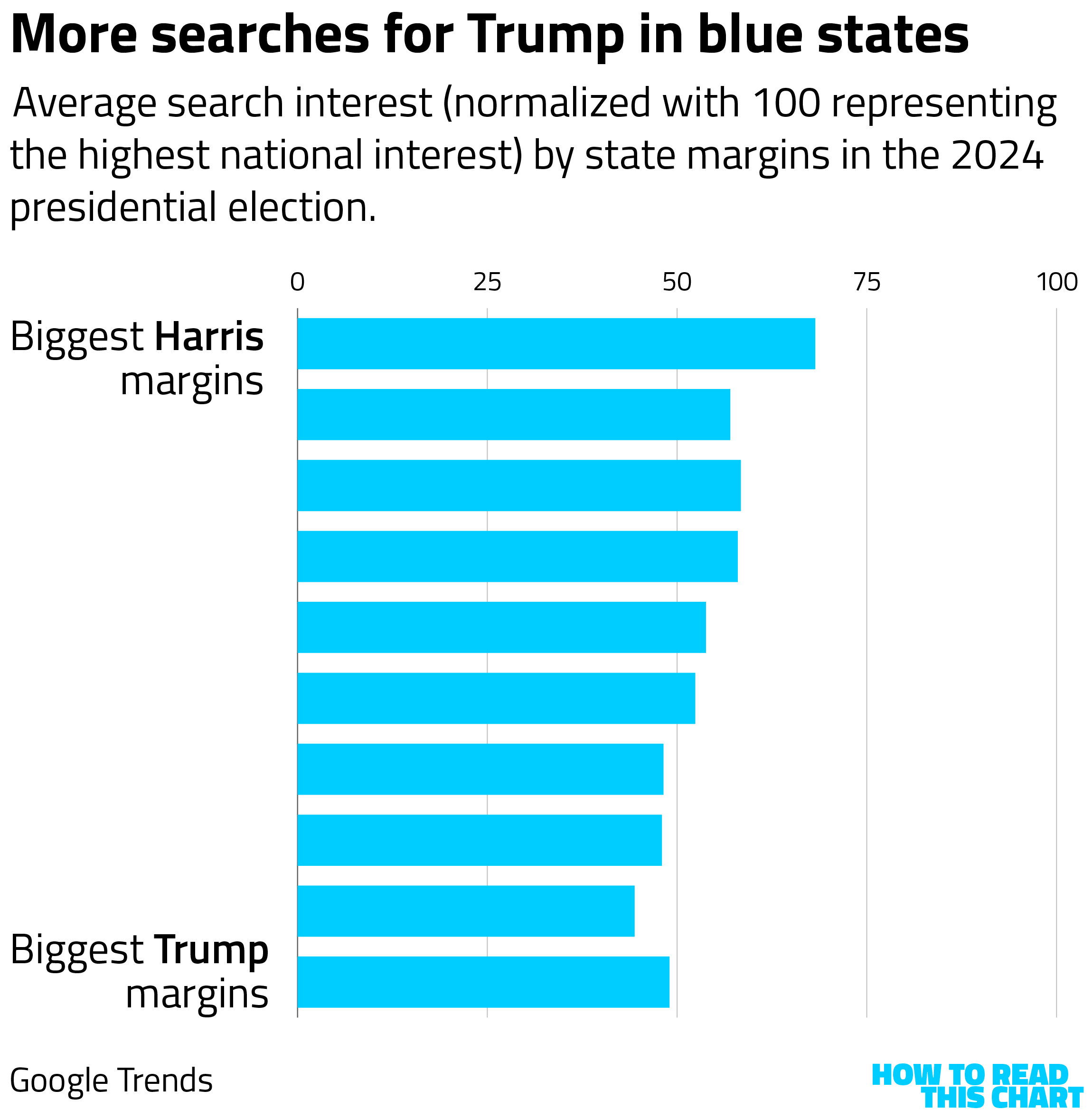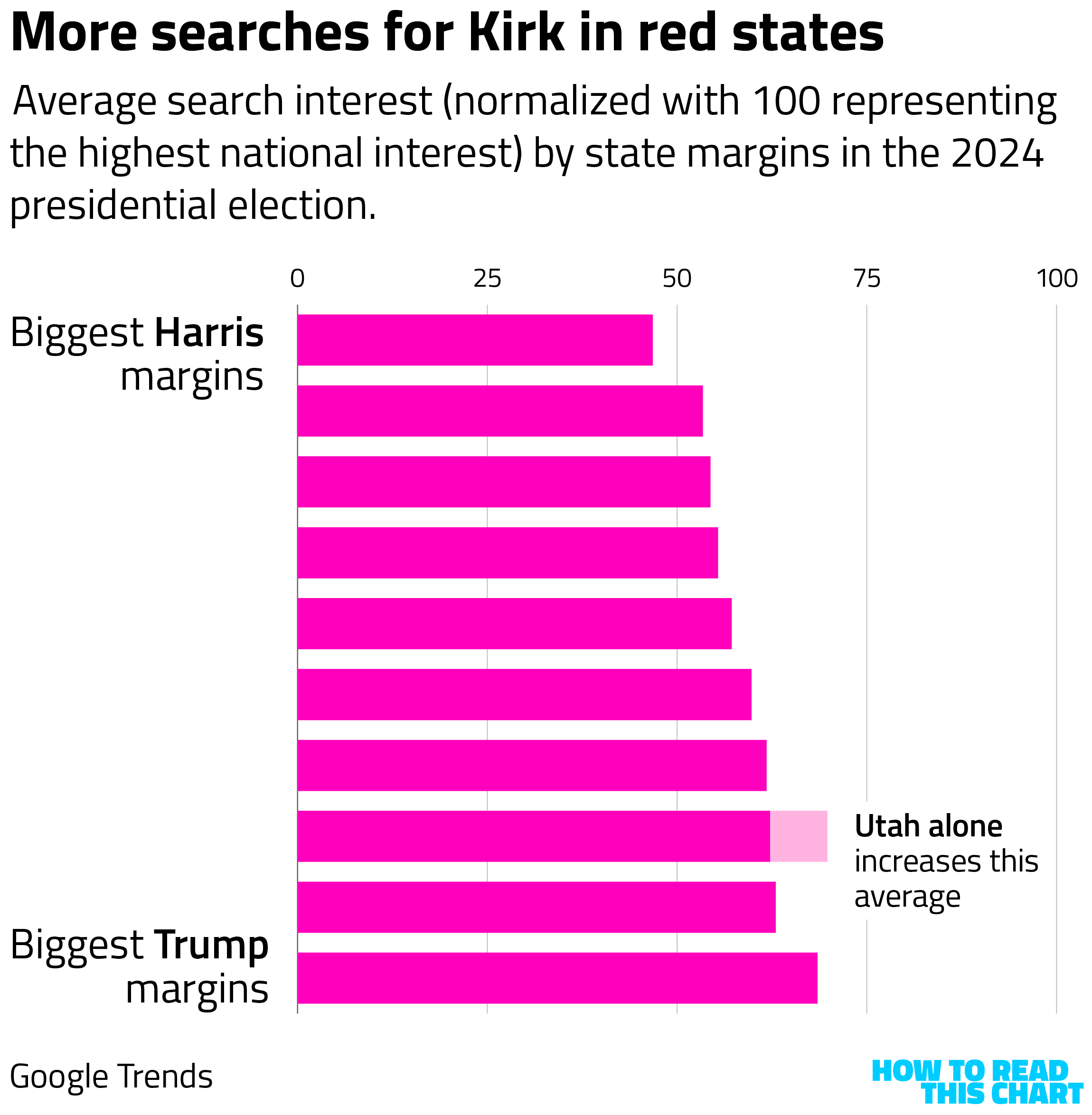 Incidentally, we can suss out some partisan differences from the Google data, too. The story that generated the most overall interest, Axios found, was the assassination of Charlie Kirk. If we group states into buckets ranging from those that voted most strongly for Kamala Harris in 2024 to those that voted most heavily for Trump, we see that presidential voting correlates to state-level interest in the Kirk story. The only hiccup in the correlation is due to the interest in Utah, where the killing occurred.