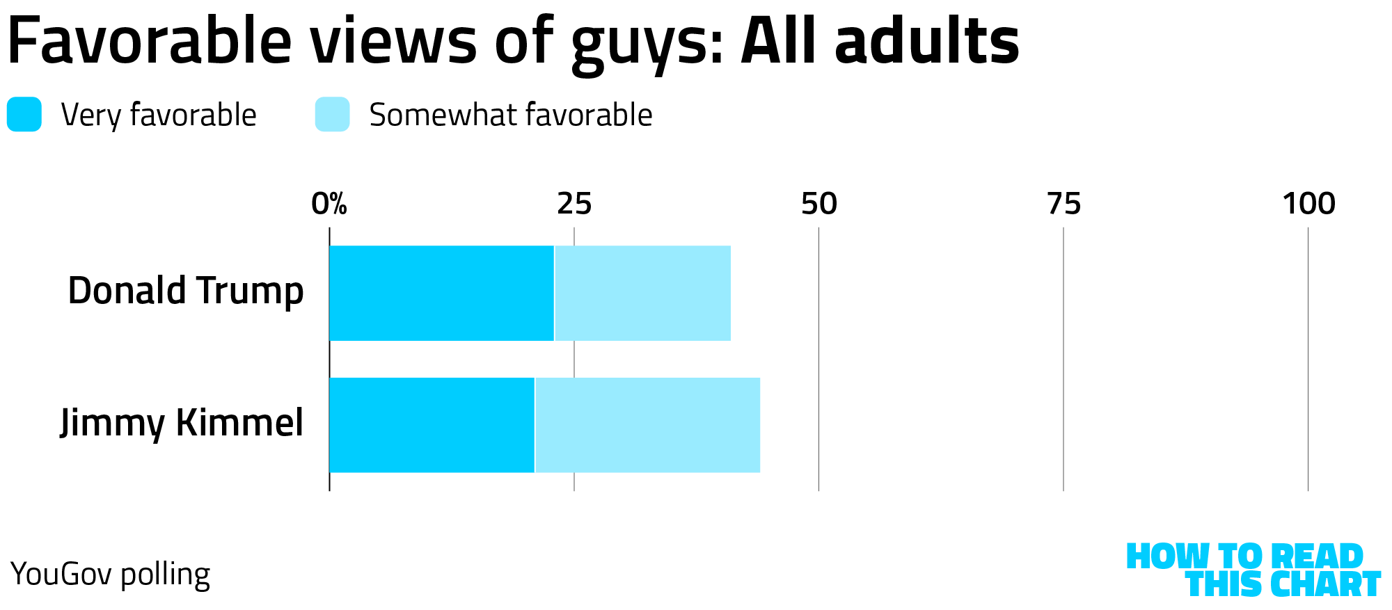 This claim is based on polling conducted by YouGov for The Economist and, in fairness, Kimmel's lead isn't that robust. About 44 percent of U.S. adults have a very or somewhat favorable view of Kimmel compared to 41 percent who view Trump that way — a 3-point difference that's well within the poll's margin of error.