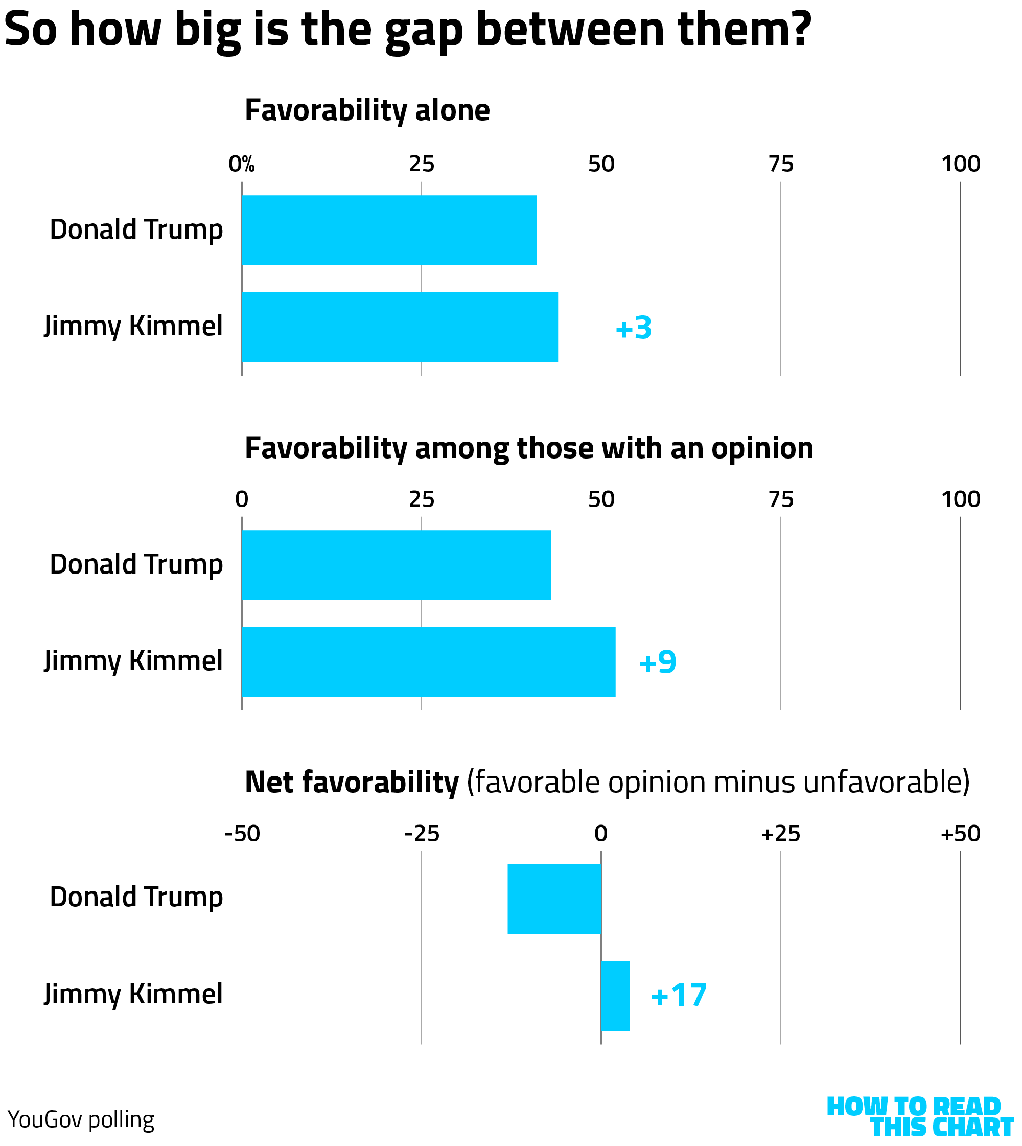 Another way to account for those without an opinion is to look at net favorability — those who view either man favorably minus those who view him unfavorably. Here, Kimmel is above water (has a positive net favorability) while Trump is under water (has a negative one). And the gap between them gets larger still: 17 points.