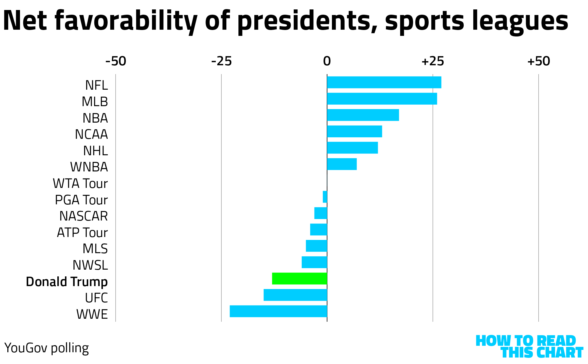 The president is viewed less favorably on net than any league, including Major League Soccer (which fares awfully poorly). The only leagues with lower numbers? WWE and UFC, which are providing Trump his Education Secretary and 2026 birthday entertainment, respectively.