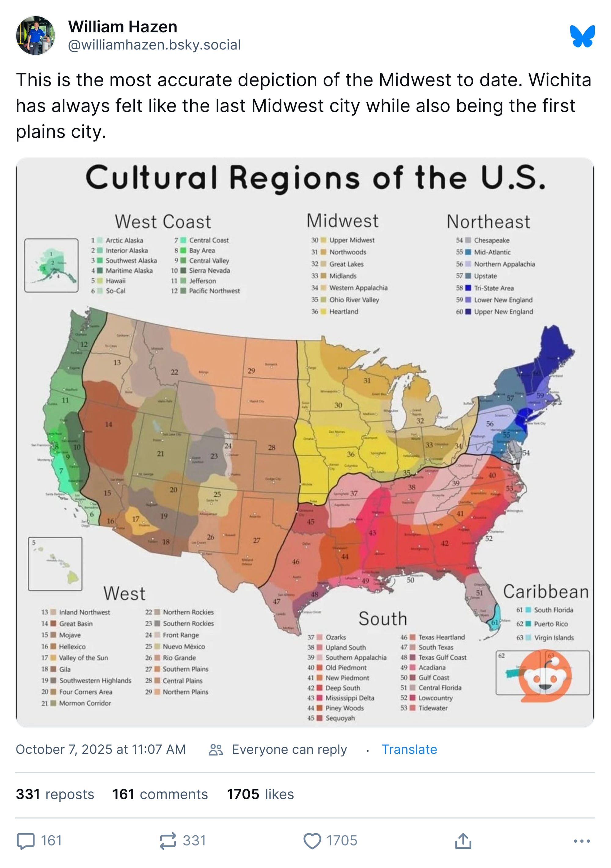Minnesota, of course, is in the Midwest, along with western Pennsylvania and eastern Kansas. The South covers most of West Virginia (no doubt to its founders' chagrin) and Reno is on the West Coast. I don't make the rules; this diagram does.