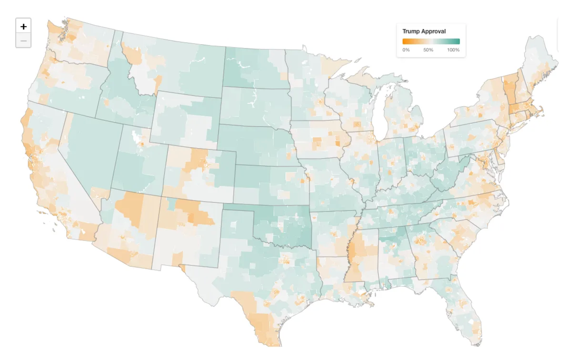The first, from G. Elliott Morris's Strength in Numbers newsletter, shows Trump's approval rating at a county (and lower) level.