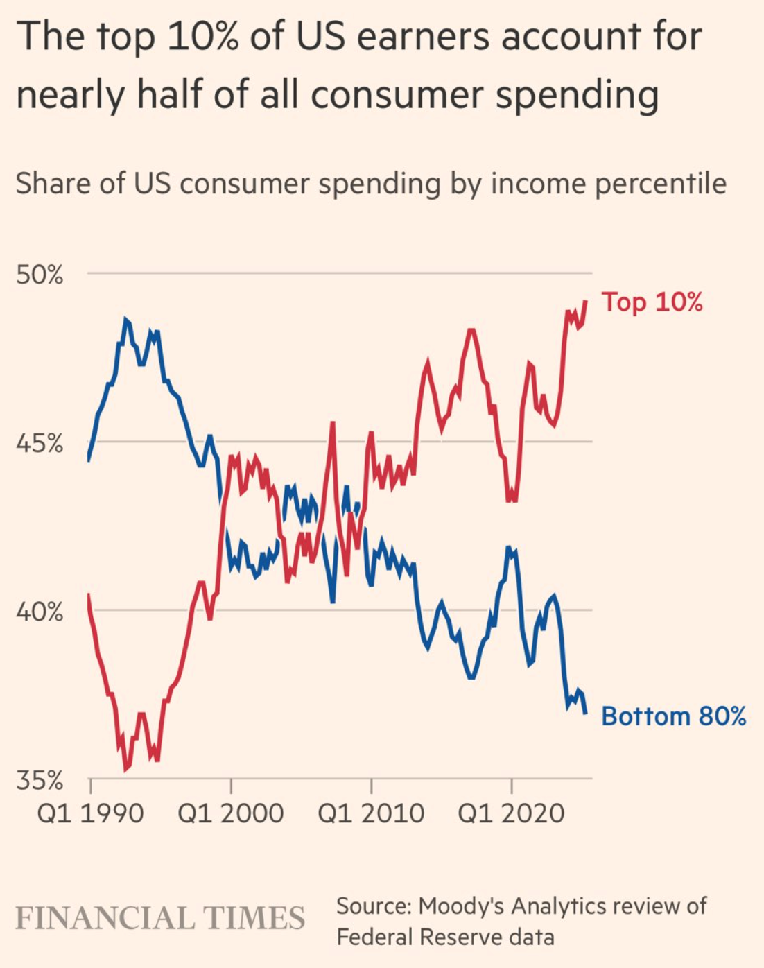 We start with a chart from a December Financial Times story that just started getting traction this week. Nearly half of consumer spending in the U.S. comes from the wealthiest 10 percent of incomes. Neat!