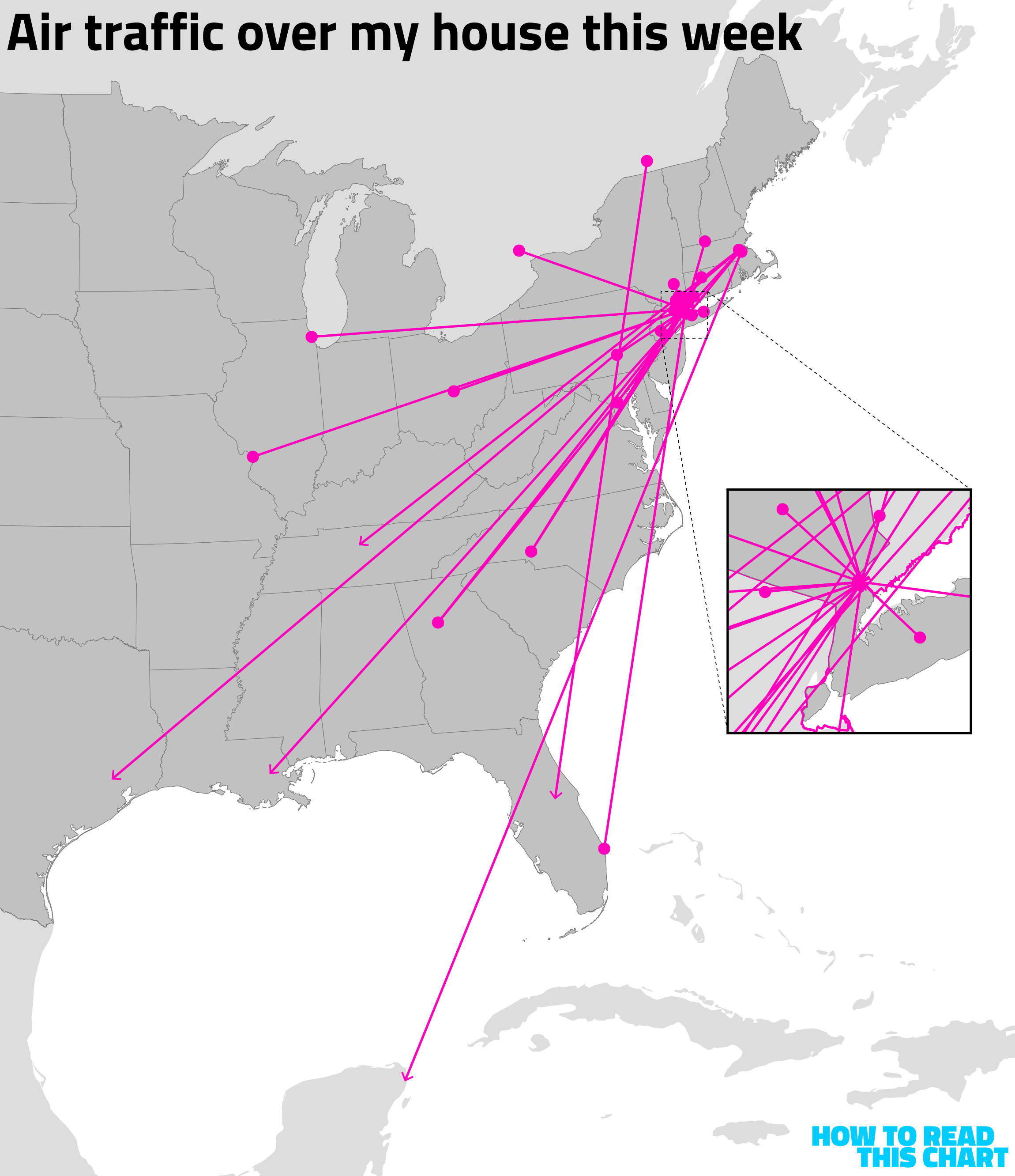 But my eyes were also opened by the patterns is found in the overhead traffic. For example, a lot of flights from Boston pass overhead on their way to cities in the South. I also found that there were a lot of private planes over my house that were headed to or from the airport near White Plains. One flight from Montreal to Florida passed overhead as it sought to avoid a storm.