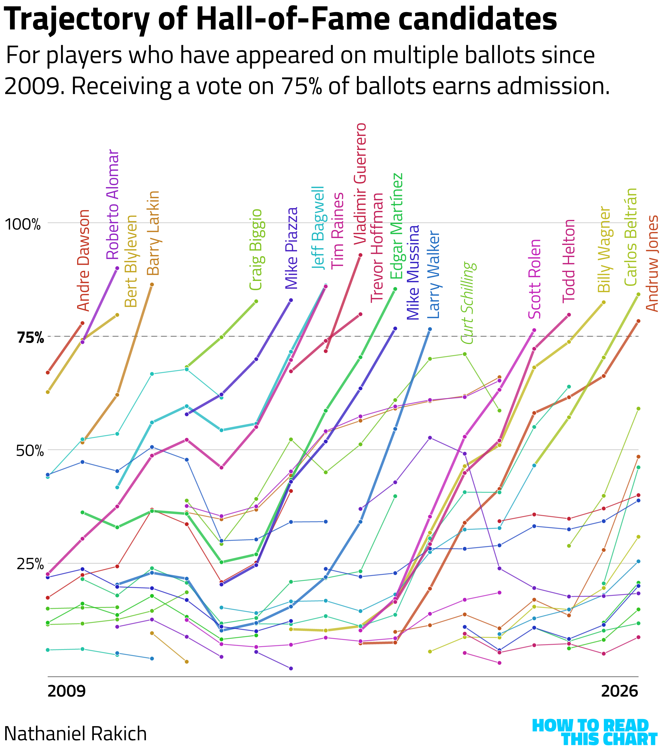 This week also saw the finalization of voting for the Baseball Hall of Fame. Carlos Beltran and Andruw Jones earned the honor, and good for them. What I'd like to highlight, though, is Nathaniel Rakich's aggregated data on voting, which allowed me to make this chart showing the upward trajectory most Hall of Famers take toward selection. (To gain entry, retired players need to be selected by 75 percent of ballots cast.)