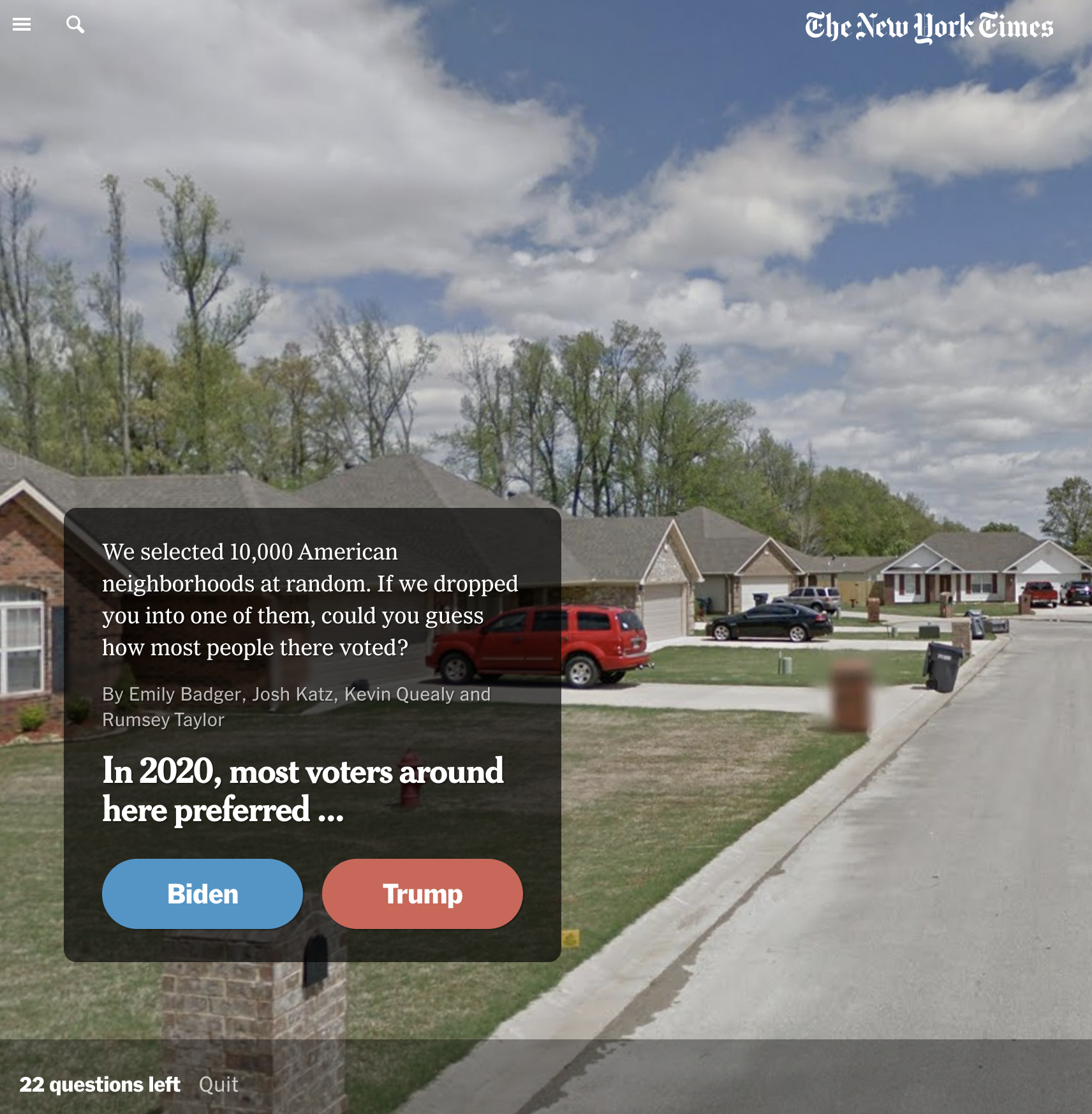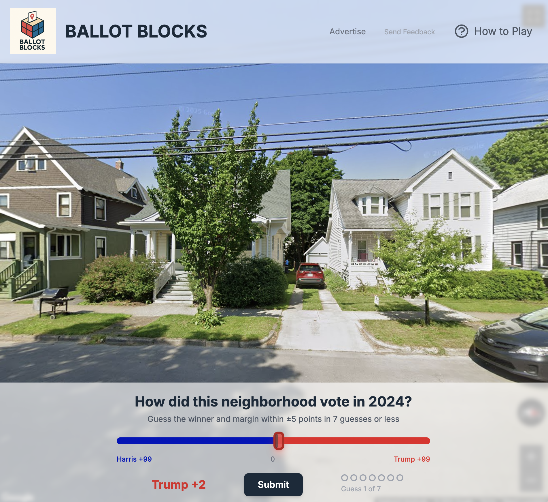 Data scientist Alex Lundry created a tool called "Ballot Blocks" which shows a Google Street View image of a neighborhood somewhere in the U.S. Your task is simple: guess who won the neighborhood in the 2024 presidential race, and by how much.