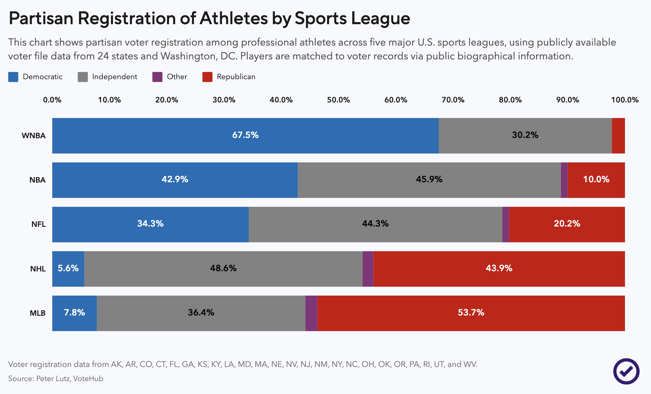 Every so often, I come across a data analysis that makes me very mad because I wish I had done it. VoteHub's look at the party registration of professional athletes is one such exploration.