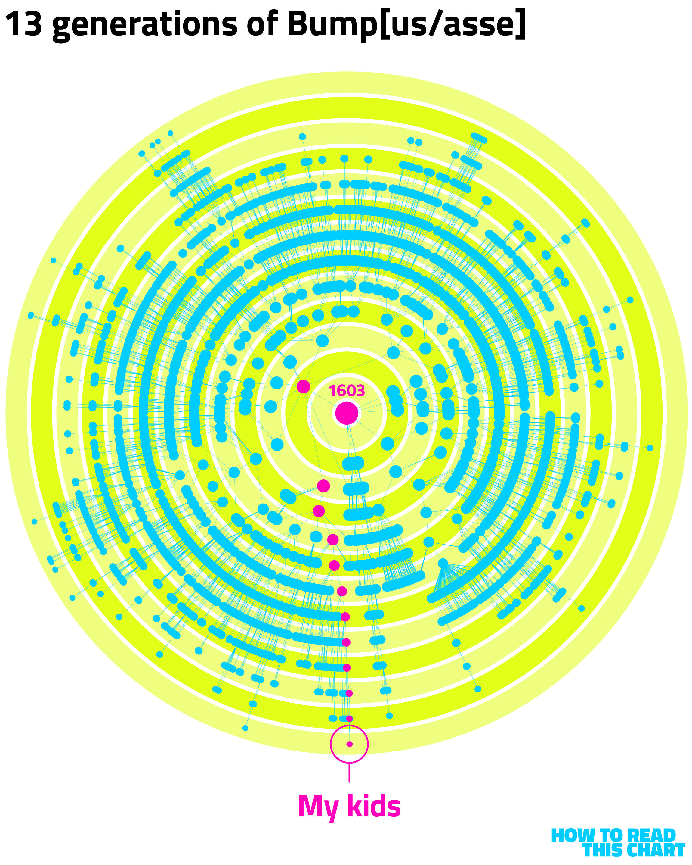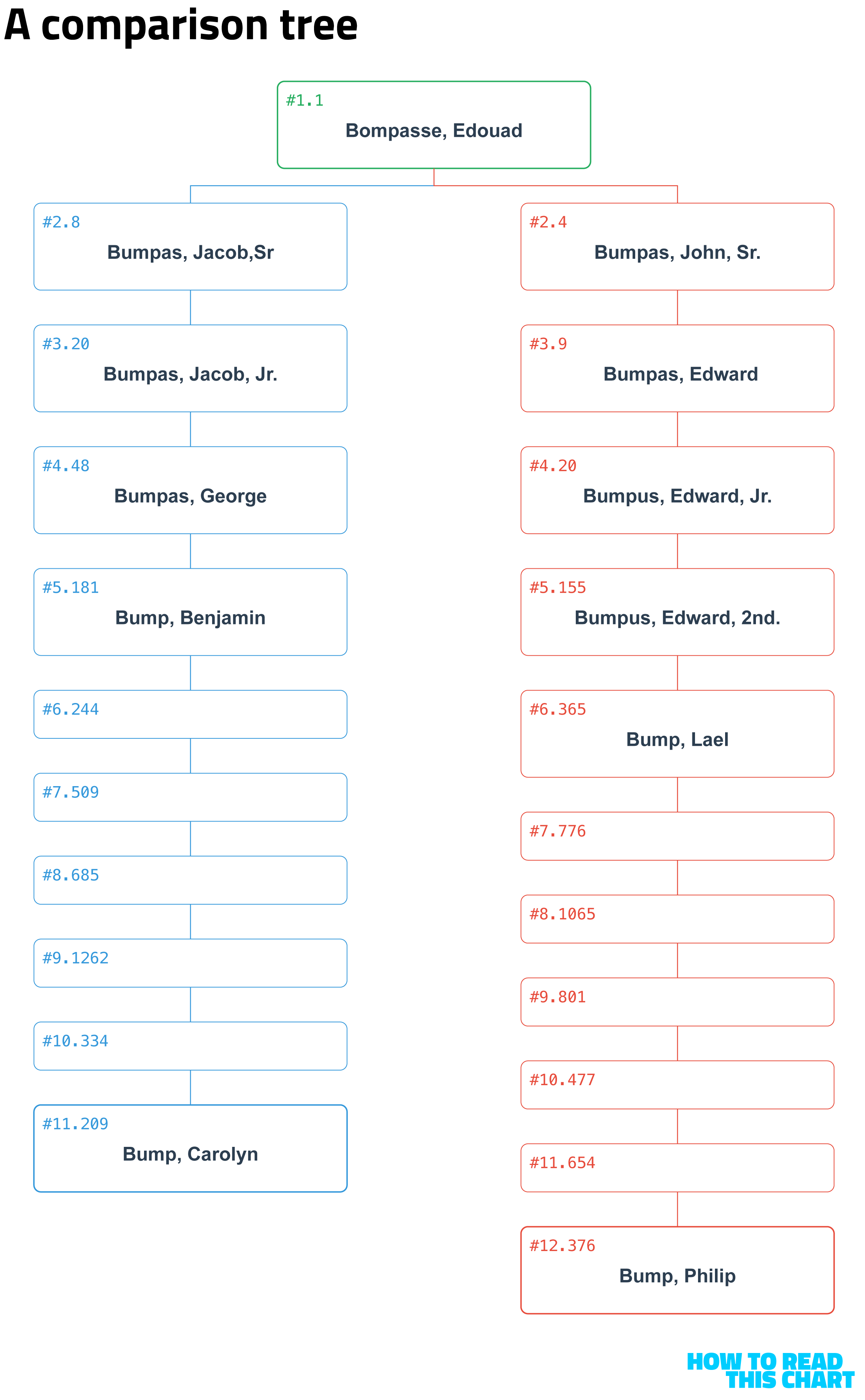 The chart below was generated by the website Claude made. I just cleaned it up a bit and removed the names of ancestors once they'd become Bumps.
