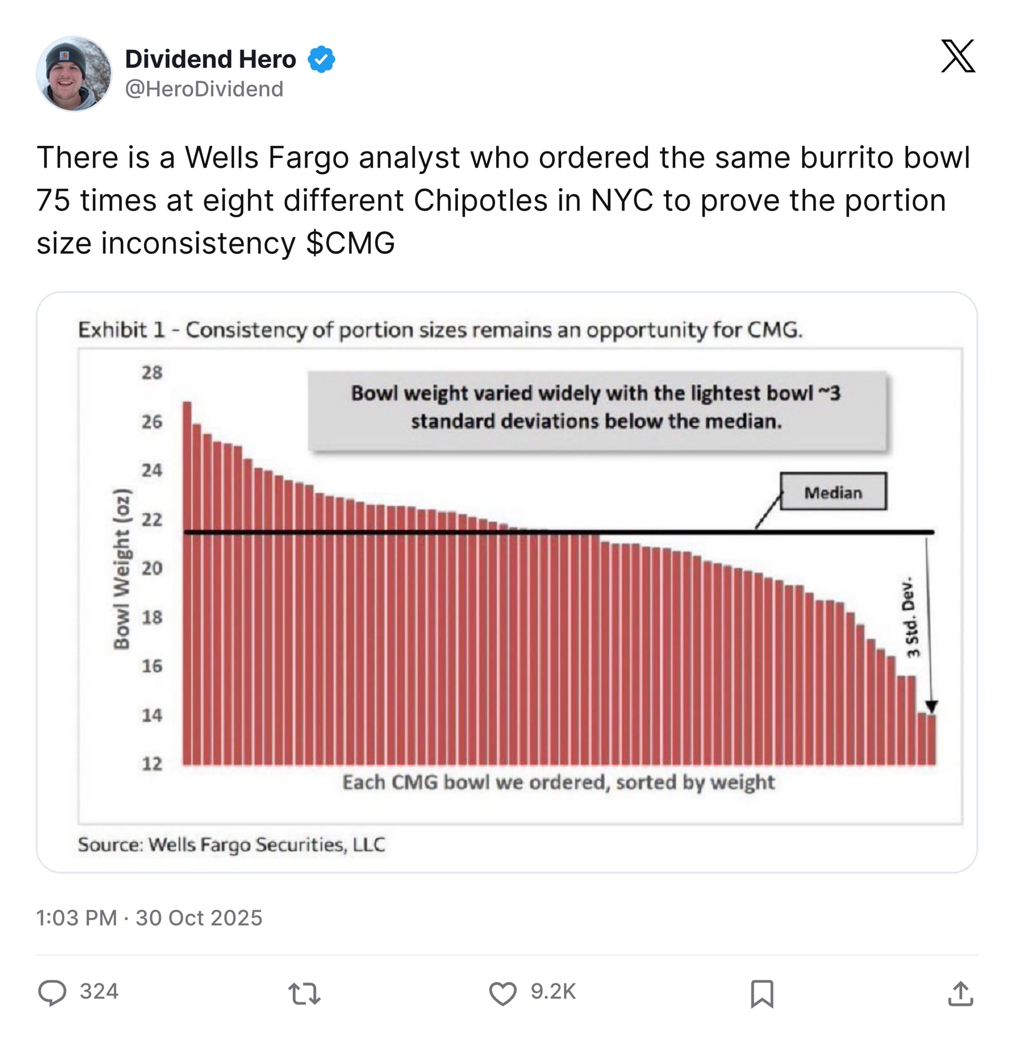 Speaking of food-related data analysis, kudos to the guy who bought and weighed dozens of Chipotle burrito bowls, showing, I guess, where to get the most meat for your money.