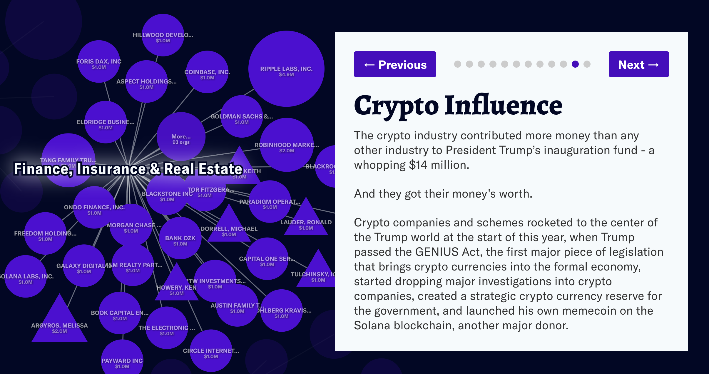 The site More Perfect Union created a network-style visualization showing the donors who gave to Trump and how they've benefitted from his administration.