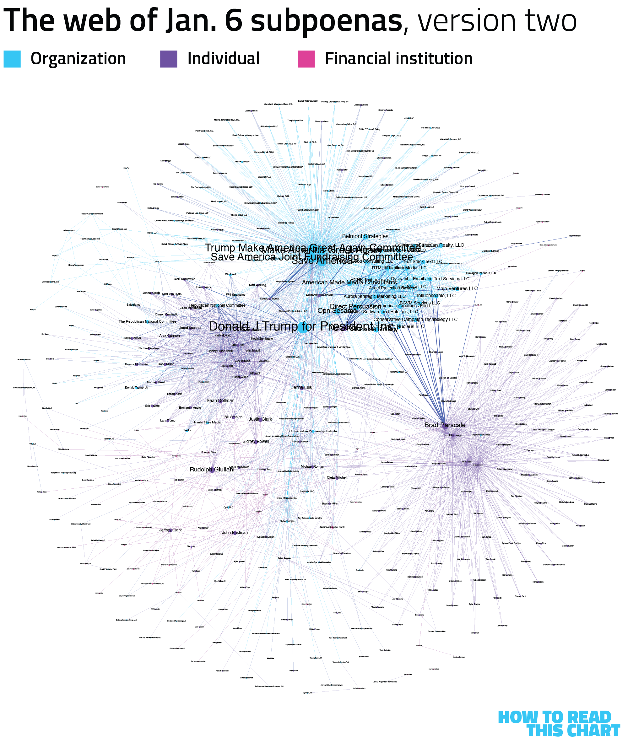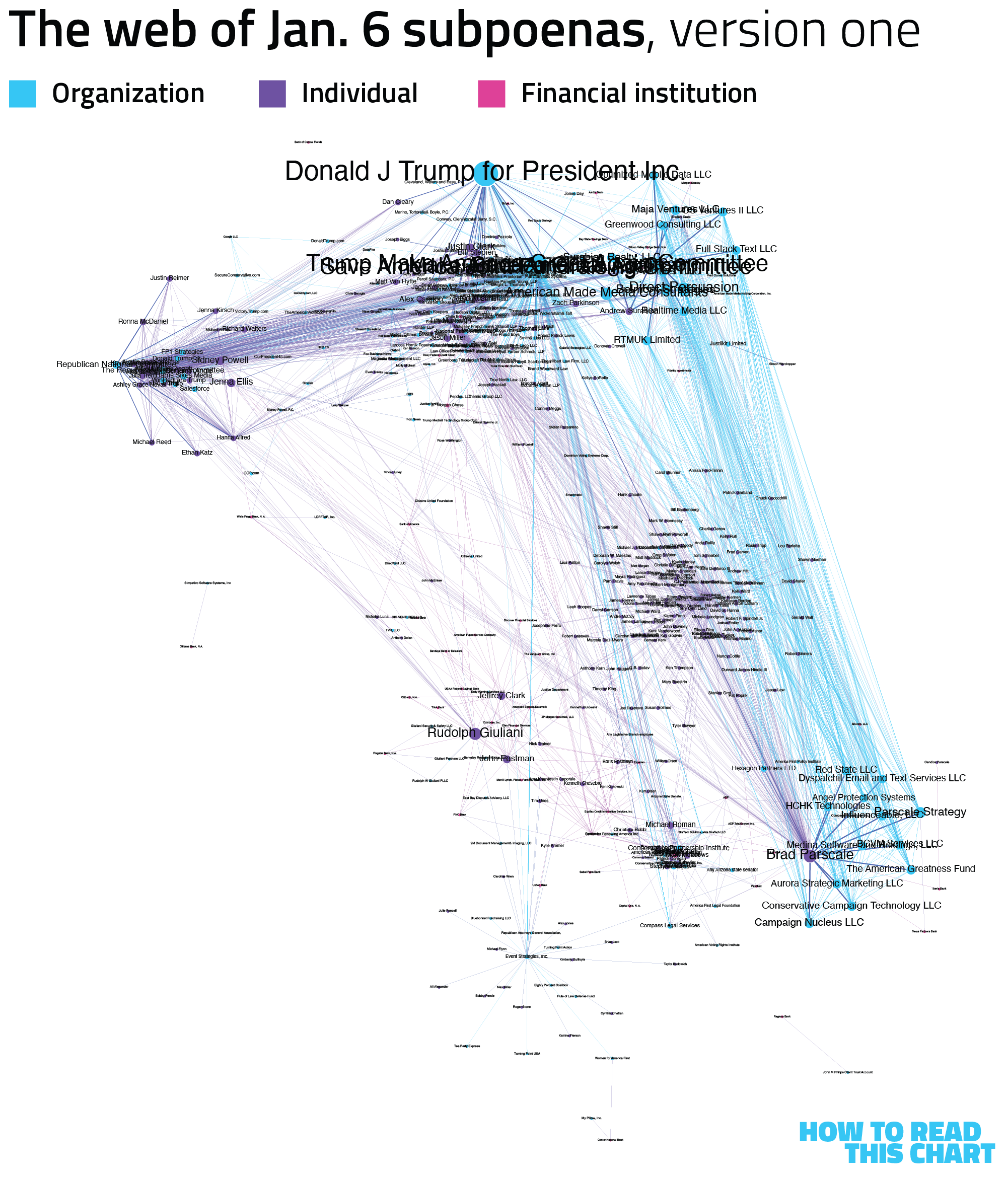 If you look very closely, you can also see one of the most important elements of the connective tissue here. Many of the subpoenas target financial and technology companies, organizations asked for information about bank or email accounts. They're small in our visualization because they are not generally mentioned as targets of subpoenas. But those subpoenas are useful in tying people to organizations and to each other.