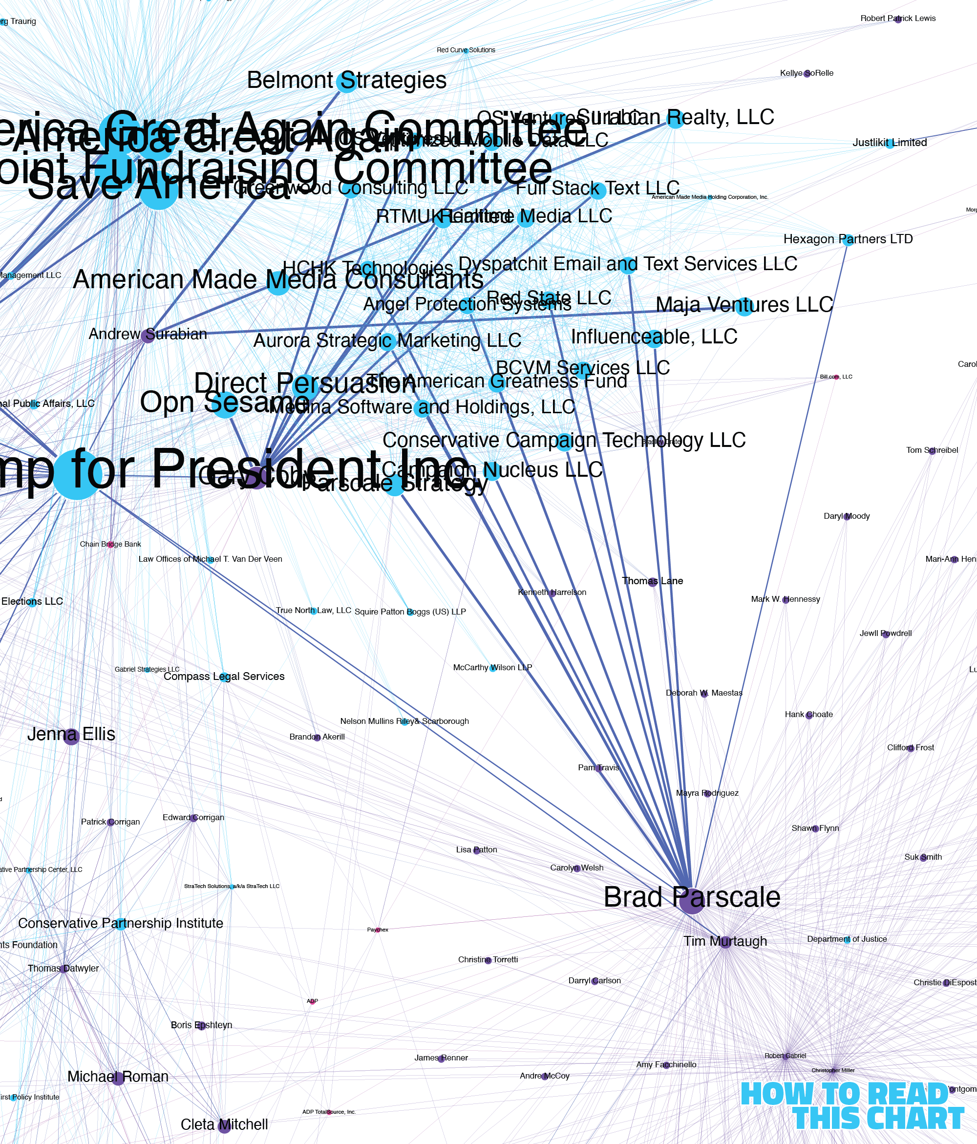 At right and a bit below the middle, you can see a number of organizations tied both to former Trump campaign manager Brad Parscale and Trump's political committees. Parscale's name is mentioned a lot, in part because he's tied to so many of these companies that Smith's team believed to be involved in the post-election efforts.