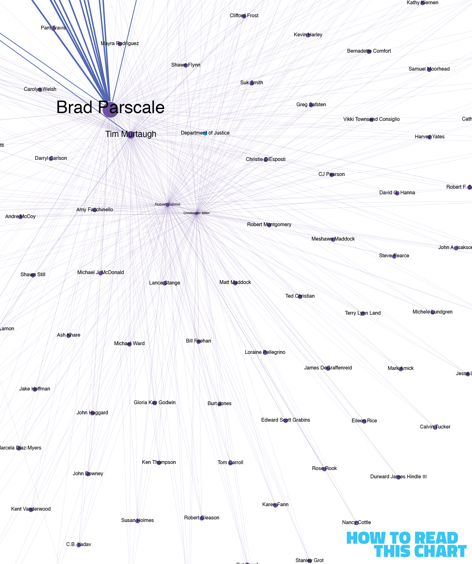 That said, something interesting happens when you (as I did) walk through the 1,700-plus pages of documents and correlate all of the Persons A and Organizations B. You get a network of connections, one that also inherently highlights participants more important to the network.