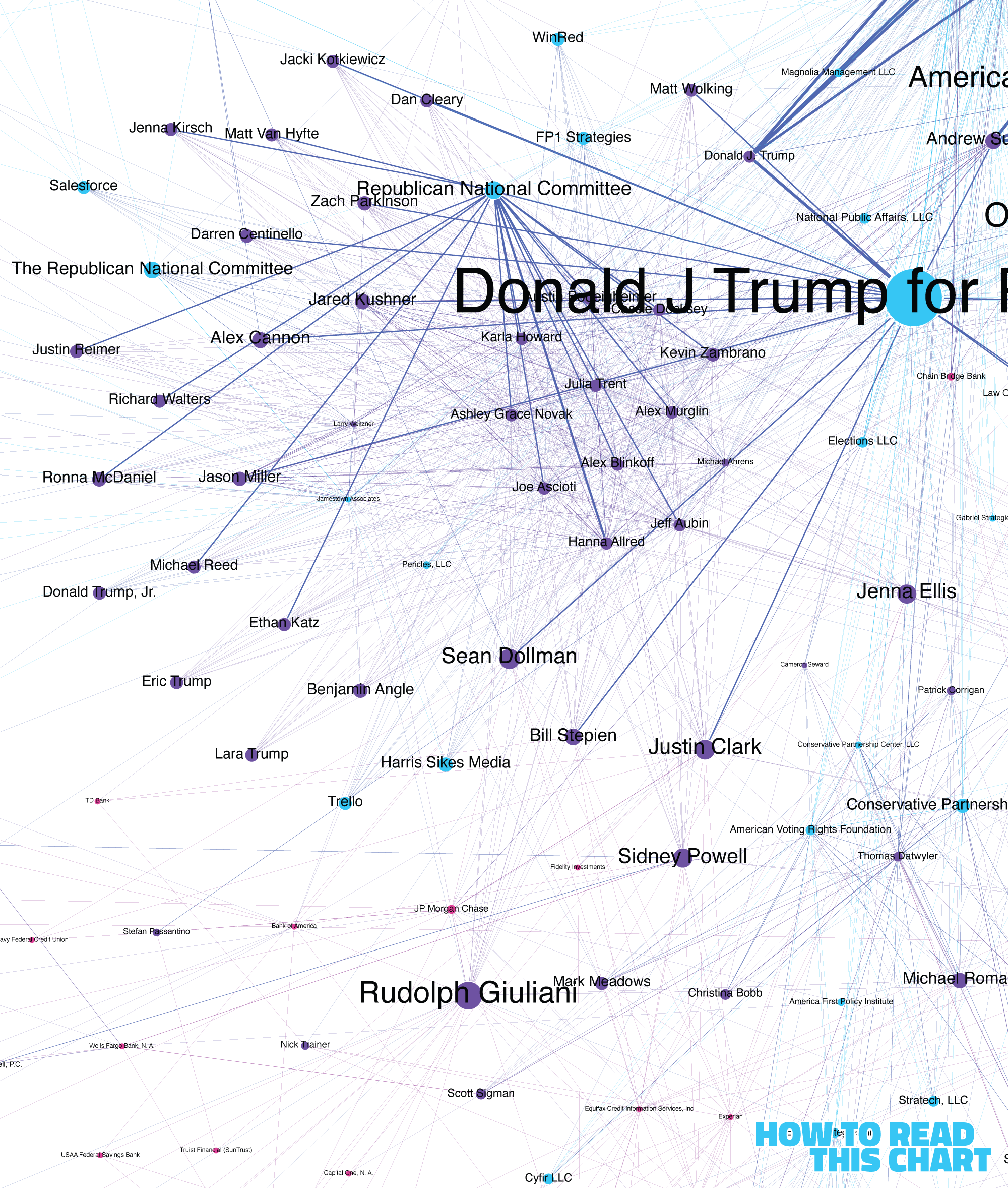 There are a few things that stand out in that image, most notably that the Trump campaign ("Donald J. Trump for President, Inc.") is the largest node. That's because it has the most mentions in subpoenas which, given the context, isn't really surprising. It sits just above a muddy collection of other campaign and political entities, and is tied into clusters scattered around the image.