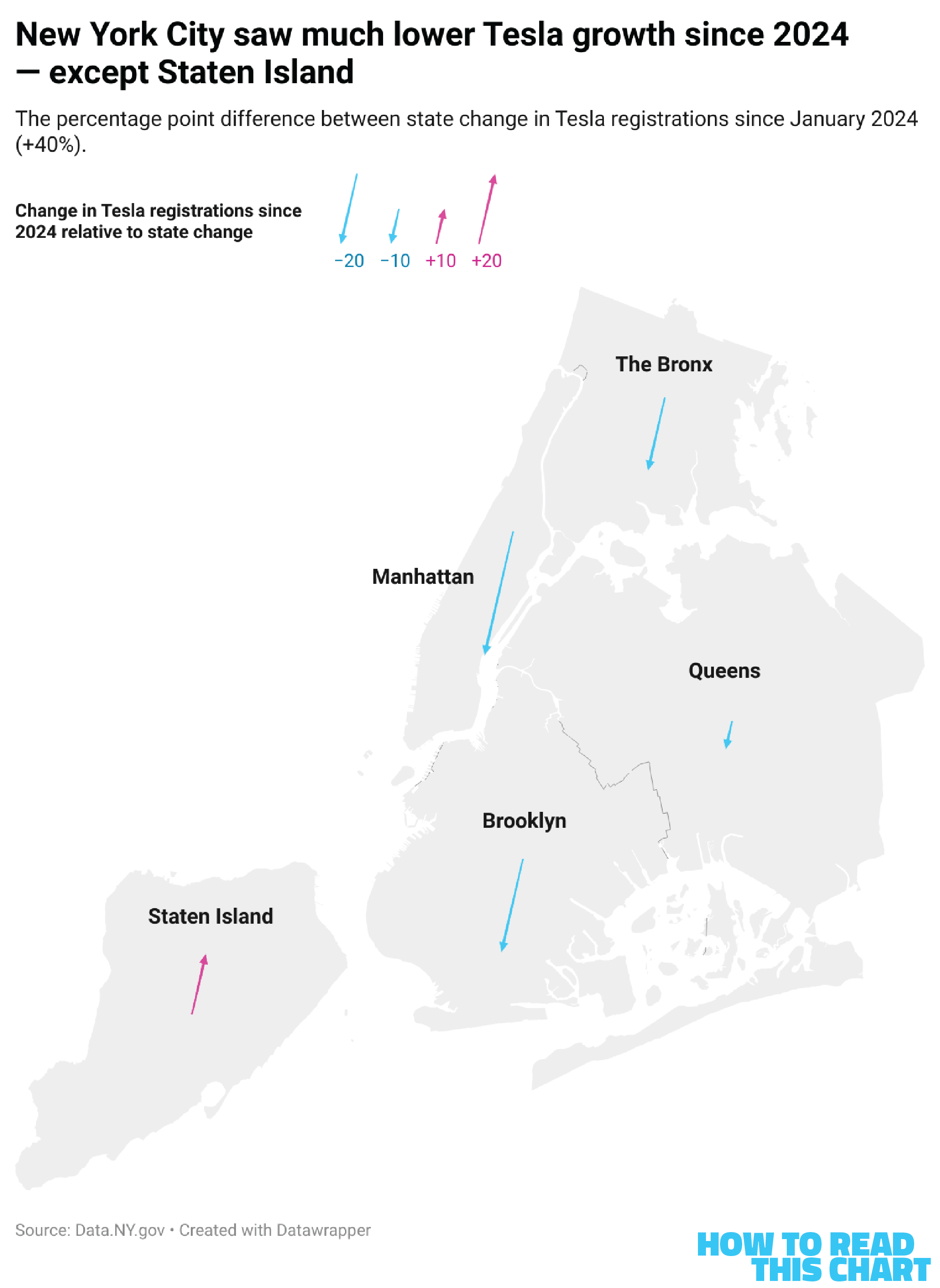 See the pattern? If we zoom into New York City (one of the few places where ownership growth was consistently slower than the state), it becomes very clear. In Manhattan, the Bronx, Queens and Brooklyn — all reliably Democratic — Tesla growth was slower than the state. On Republican-voting Staten Island (emotionally and culturally part of New Jersey), Tesla sales outpaced the state.