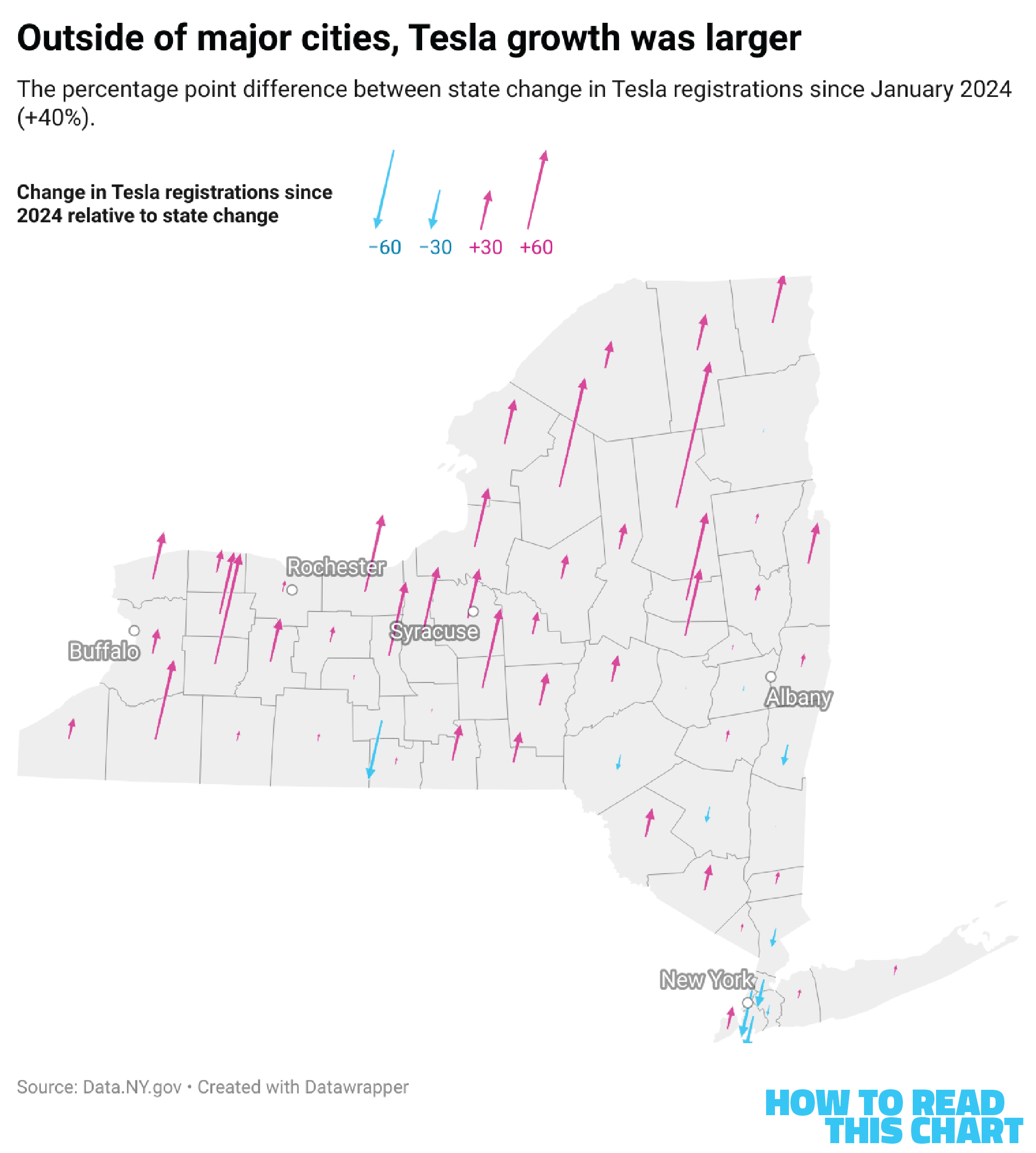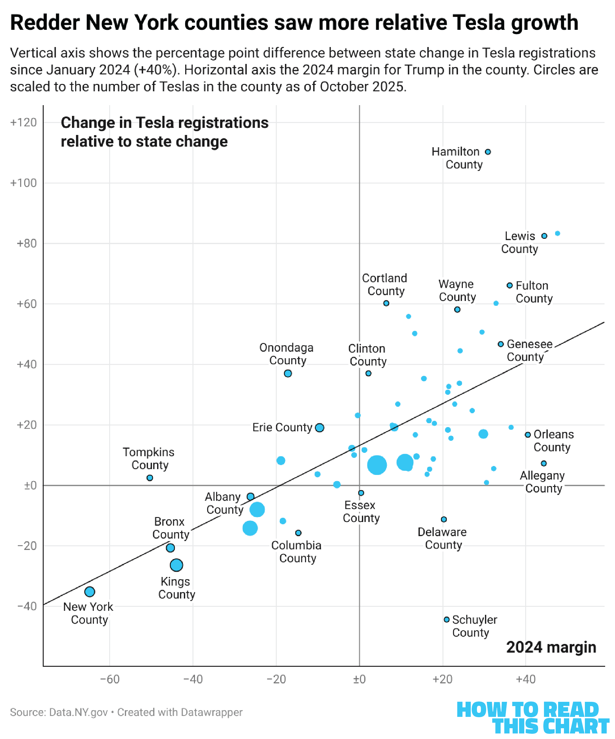 Where things get interesting is when we look at change relative to the state overall. Across New York, there was a 40 percent increase in the number of Teslas from then to now. In individual counties, though, that change varied.