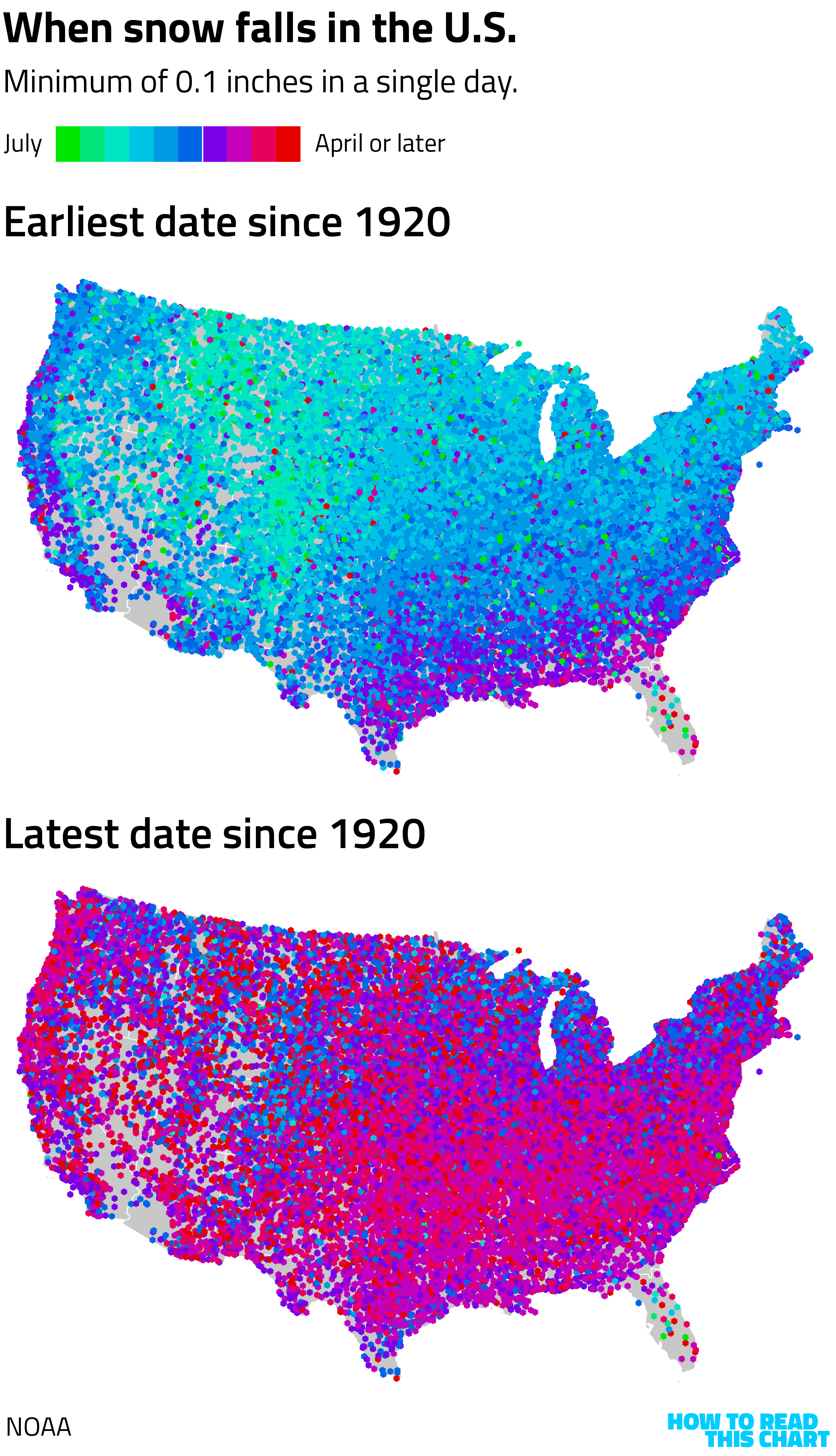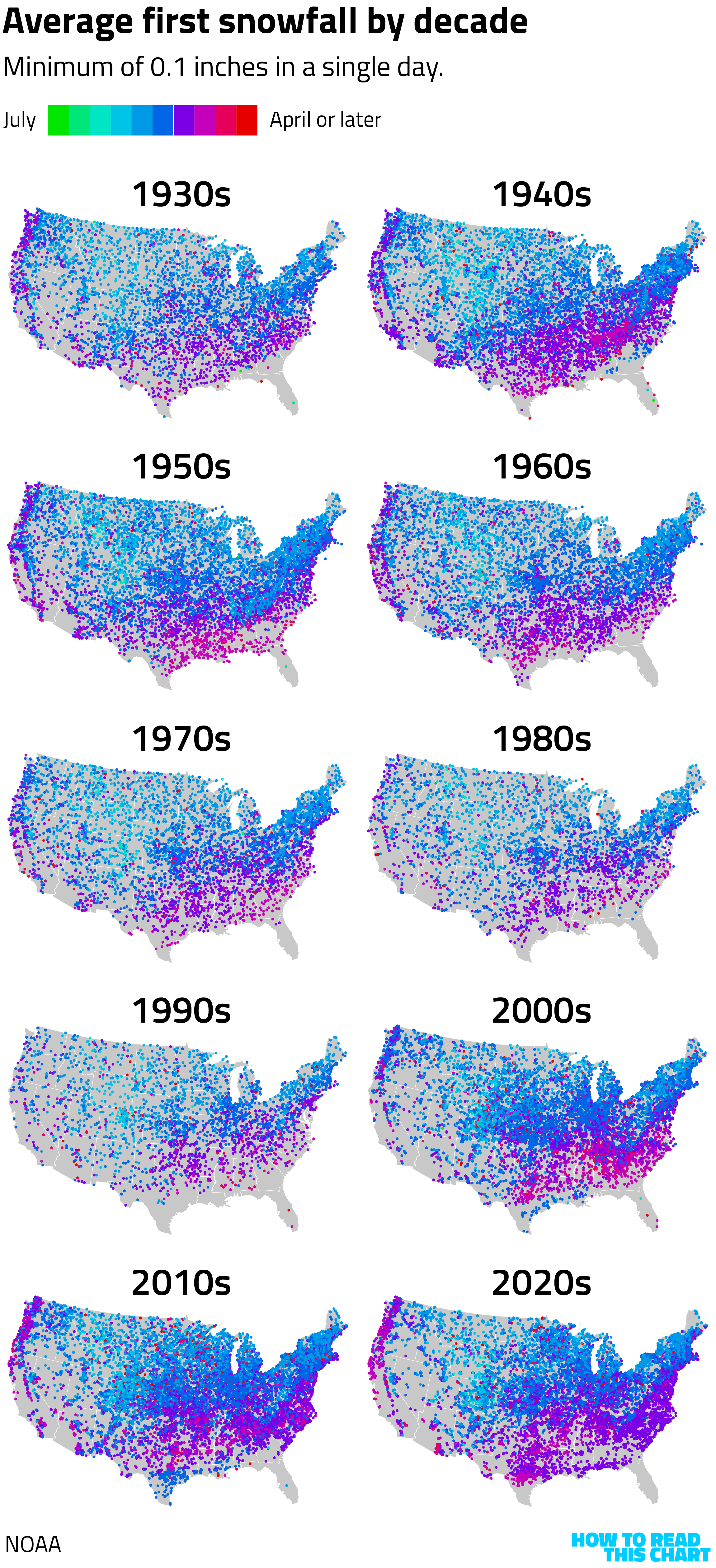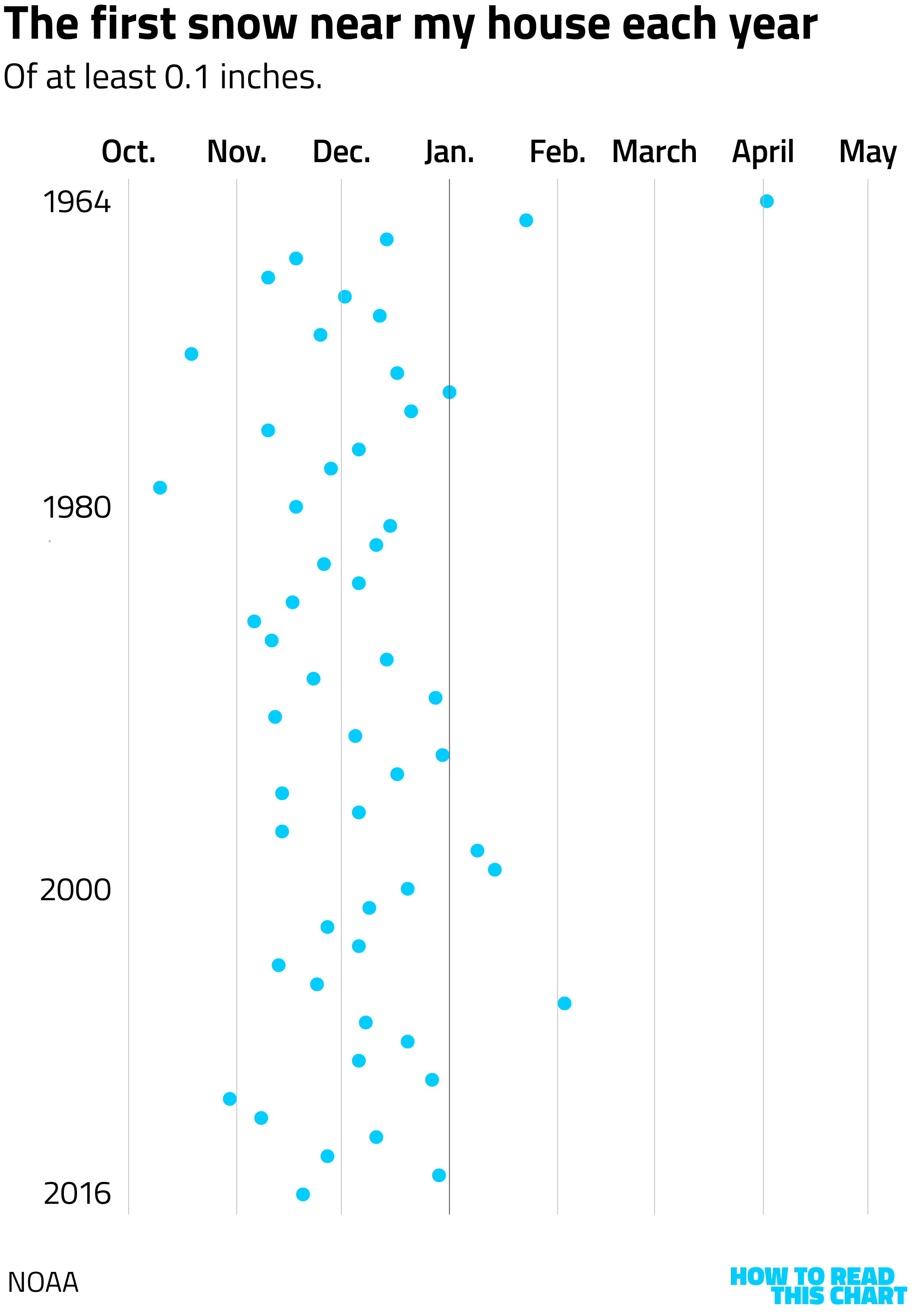 The National Oceanic and Atmospheric Administration (NOAA) has collected data on precipitation (and temperature and all the other things you'd assume) at weather stations around the world for decades. This allows us to track weather events over time in a useful way — like when it first snowed each year.