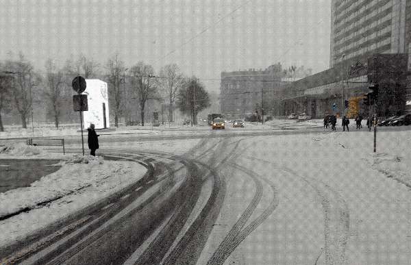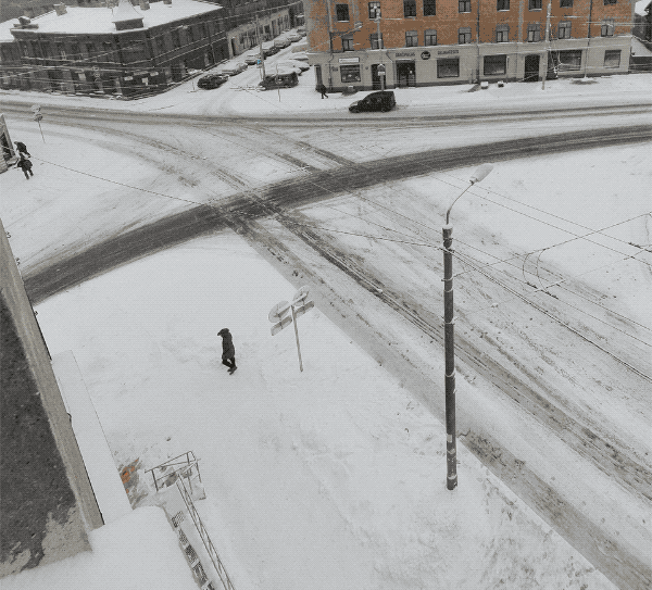 A "sneckdown," then, is a temporary neckdown created by snow. Either because snow has been plowed into banks or because cars haven't driven over it, snow builds up and serves the same function as an intentional, permanent curb adjustment.