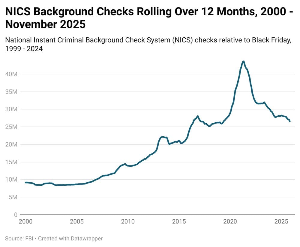 There is at least one trend that the political left will find somewhat comforting, though. The number of gun background checks has been sliding for the past four years, suggesting that fewer firearms are being purchased.